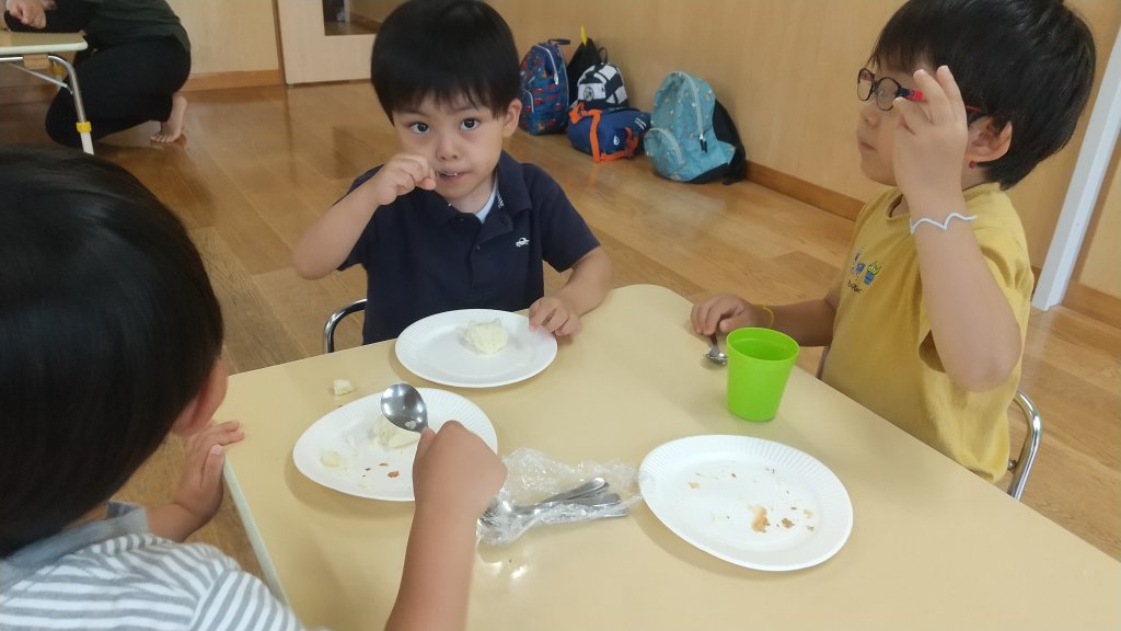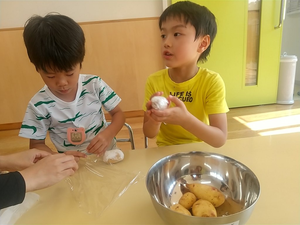自分たちで調理したジャガイモを食べて「じゃがいもの味がする」、「柔らかいほう(マッシュポテト)がおいしい」とそれぞれ感想を言い合いました。「おかわり」という声もたくさん聞かれました。家ではあまりジャガイモを食べないという子どももジャガイモを自分で育てたことやみんなで調理をして食べたことからたくさん食べることができました。