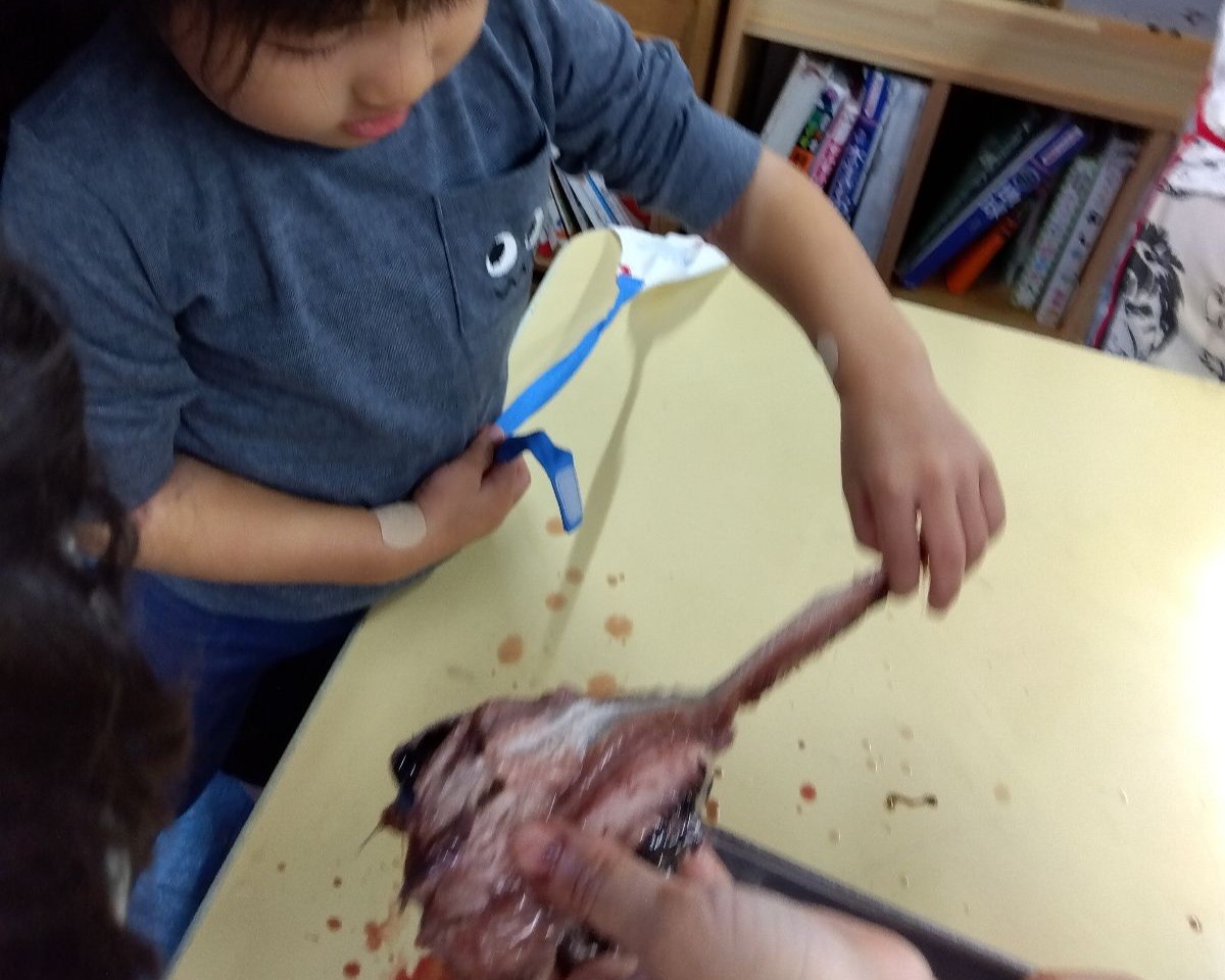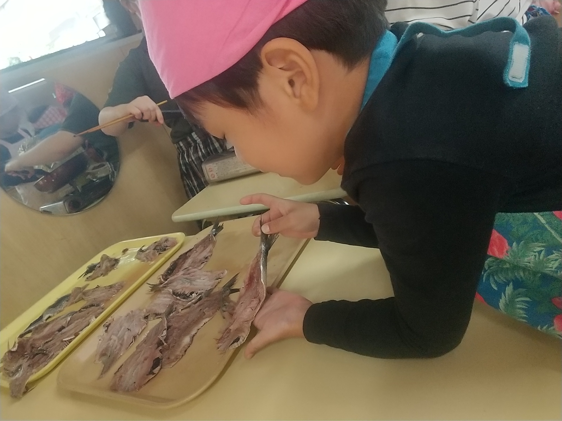 「これにする」とそれぞれ好きなイワシを選び、手開きを開始します。イワシの頭を取り、血が出てきたのを見て「こわい。先生やって。」とイワシを触れなくなってしまう子どももいましたが、生のイワシのにおいを感じたり、血を見てイワシが生きていたことを感じたりすることができました。