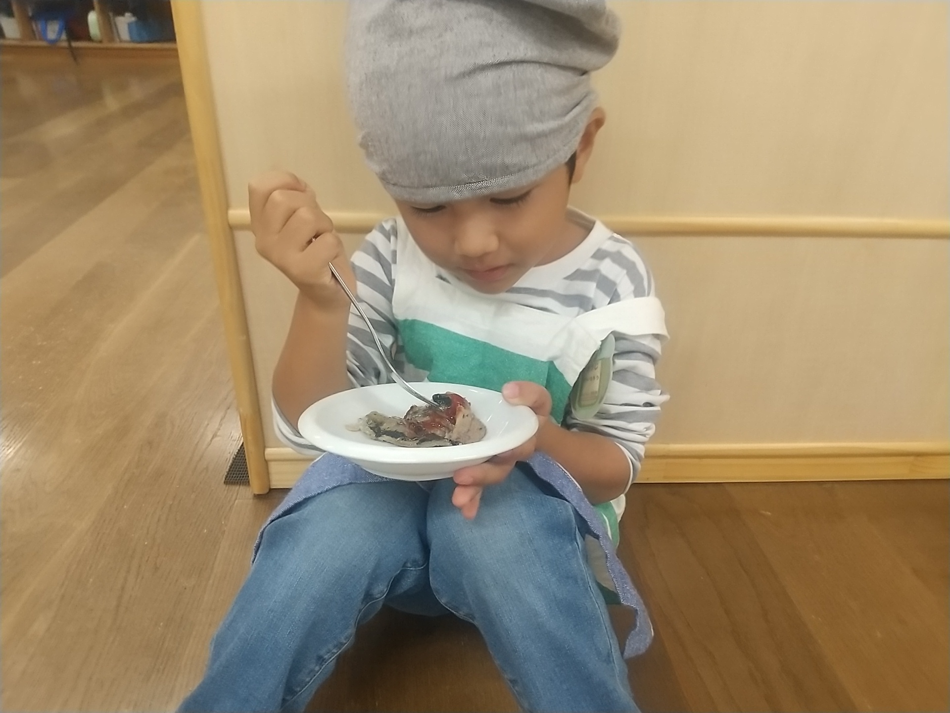 焼いたイワシはケチャップ、みそ、しょうゆから好きな調味料をつけて食べました。調味料をつけずにイワシを食べた子どもは「ここは甘い味。ここは少し苦い」とイワシ本来の味を感じることができました。給食では魚のお代わりをしない子どもがお代わりをする姿も見られました。