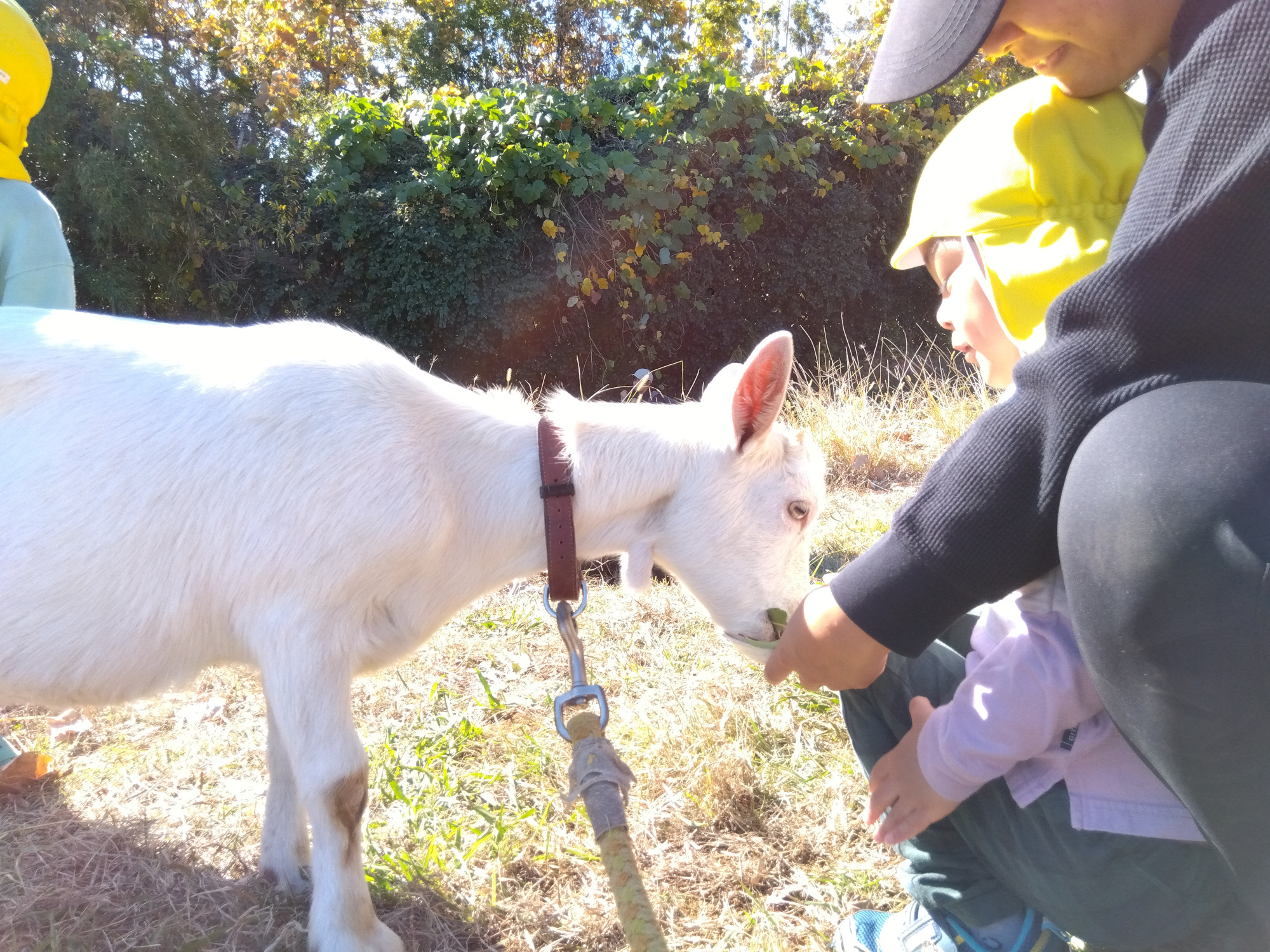 自然に恵まれた環境の中で春には花々を観察し虫を捕まえ、夏には全身びしょ濡れで水遊び、秋にはどんぐり拾いや落ち葉シャワー、冬には寒さに負けず丘陵公園の斜面上りや斜面下りなど、四季折々の自然を感じながら体を動かし様々な遊びをします。また、畑で野菜を作り、収穫した野菜を使った調理活動などの食育活動にも取り組み、食への関心が高まるような活動を実施しています。園で飼っているヤギのお世話も子どもと一緒に行い、生き物へ興味を持ち、生命の大切さも学びます。