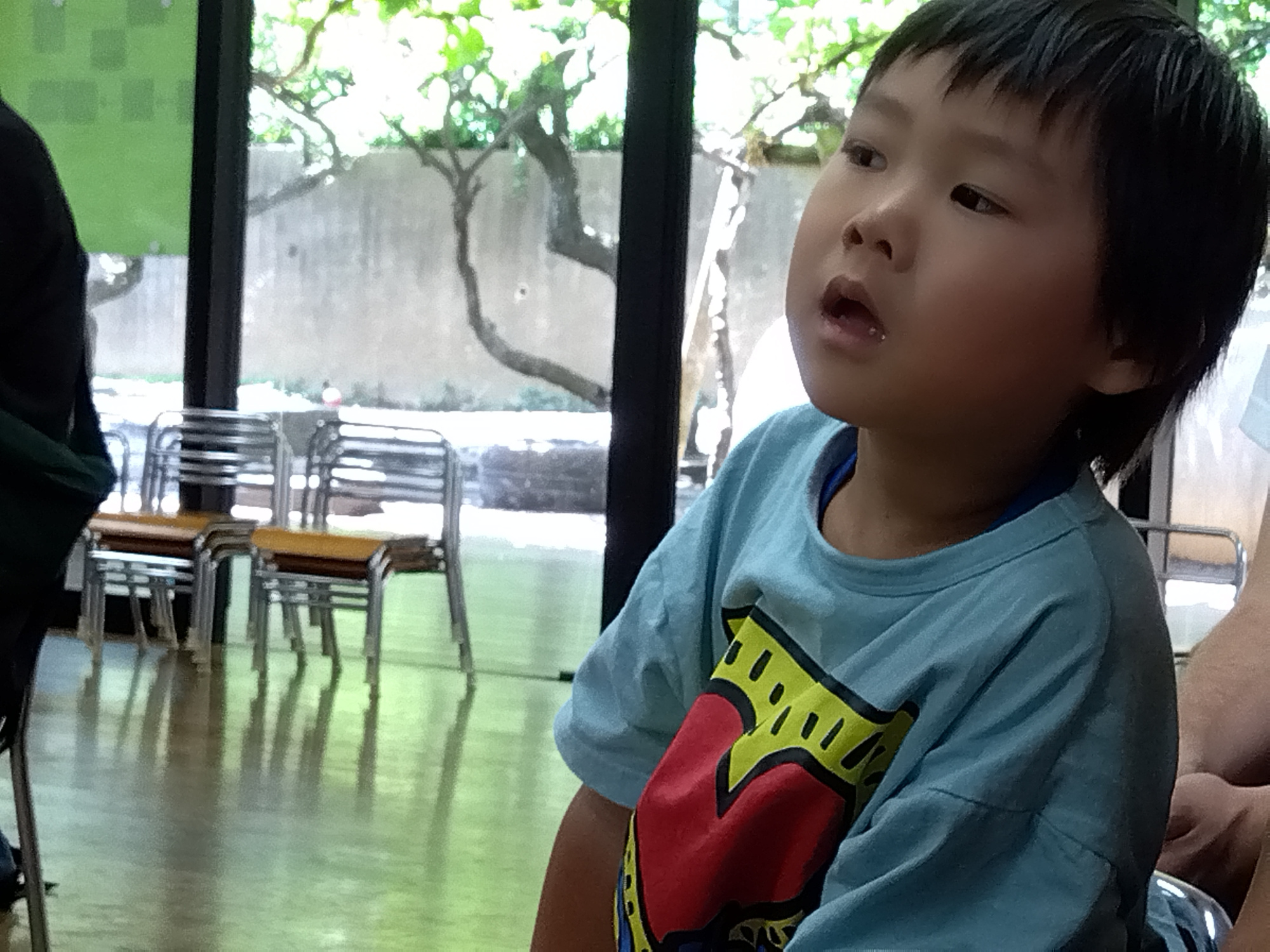 和太鼓に触れた後には、リズムを教えてもらい演者の方々と一緒に演奏する体験です。「コーヒー」「ドーナツ」「クリーム」「カステラ」と子どもたちの知っている言葉にのせてリズムを教えてもらい、子どもたちはその説明に真剣に耳を傾け、わからない時には自分で聞くなどして演者の方々との交流も楽しんでいました。楽譜代わりに用意された「コーヒー」「ドーナツ」「クリーム」「カステラ」の可愛い絵パネルを見ながら演奏しました。