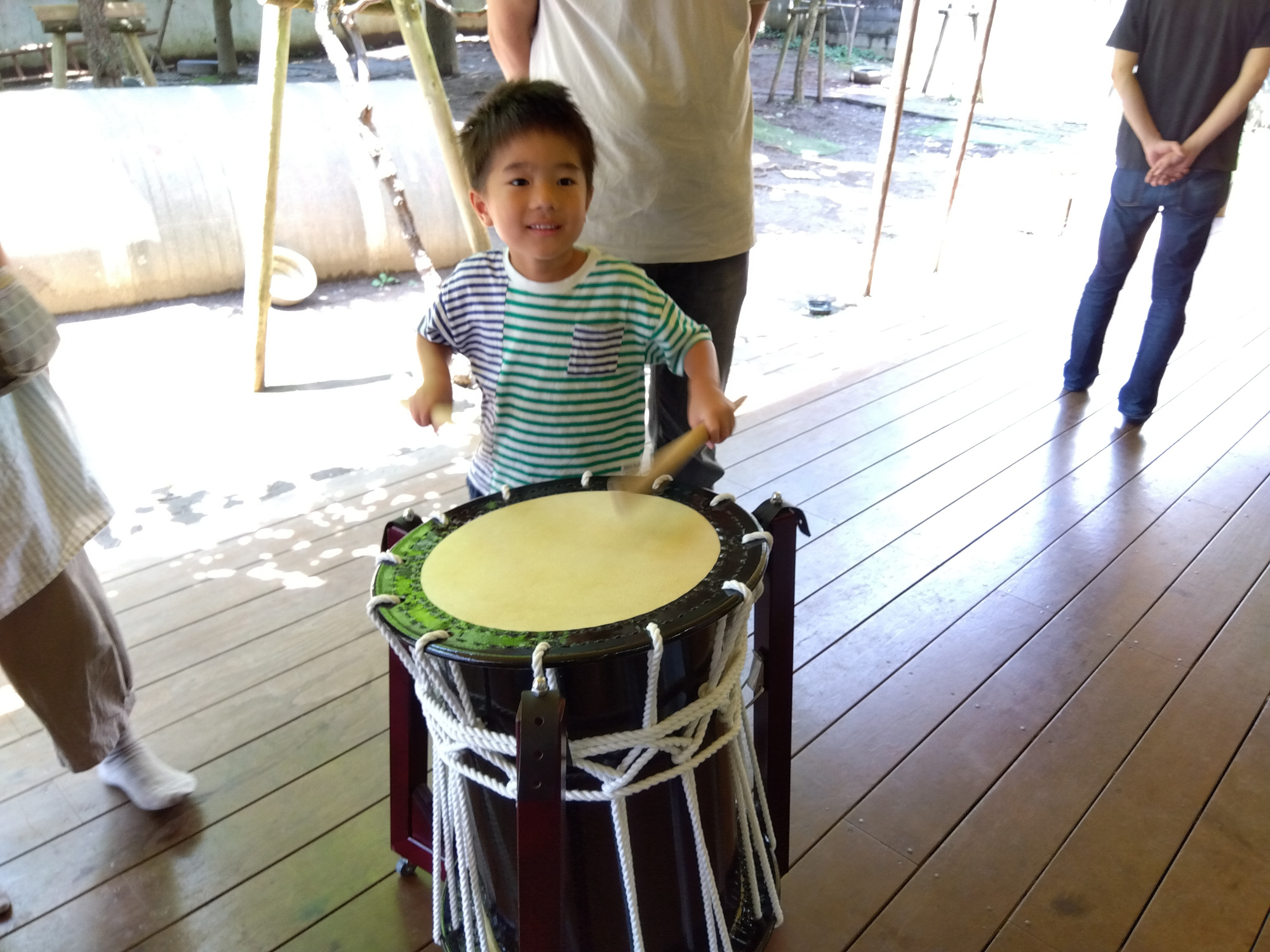 縁側で演奏を聴いていた子どもたちは、縁側にも太鼓が出てくると、大喜びで太鼓のばちを手にしていました。なかなか参加する勇気の出ない子には「縁側だと人数が少ないよ」とスタッフが一声かけると縁側に目をやり「向こうでやる」と言って縁側に出て太鼓を叩き始めました。