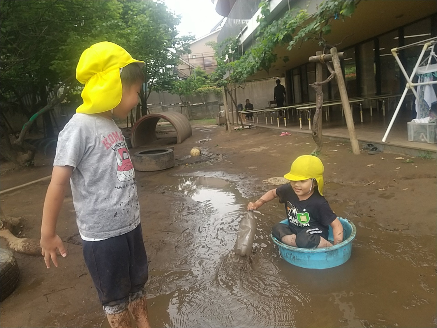 まずは大人が思いきり水遊びや泥水の中に入って泥団子を作り、遊びを楽しみました。次に、靴で出てもいいことを伝え、友達が先に遊んでいる様子を近くで見ることで「先生一緒に行こうよ」と少しずつ泥に興味を持ち始めました。その後、手や足の指で触り、「泥気持ちいいね」と言いながら、泥水に入っていくことができました。