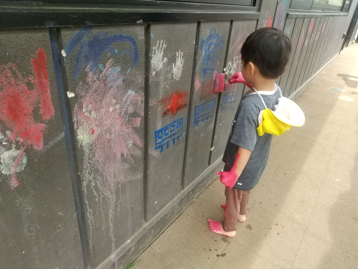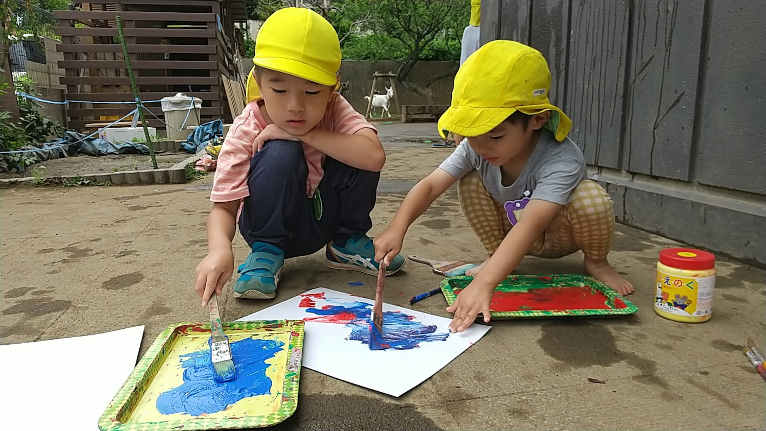 絵の具が手につくことが苦手なA君は「先生、筆ちょうだい」と言い、筆を準備することで靴を履いて園庭に出て参加することができました。また、次の日には靴を脱いで裸足で園庭に出て、友達と一緒に絵の具遊びを楽しむこともできました。「先生みてみて」と言いながら、自分の手や足で作った手形などを笑顔で見せてくれました。