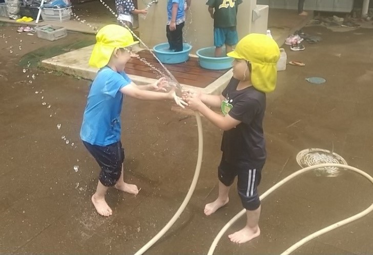 徐々に水遊びに慣れてくると、水道で1人で遊んでいたところから友達にホースで水をかけてもらうことを楽しみ、最終的には友達と一緒に水の掛け合いを楽しむなど遊びも変化していきました。仲のいい友達がホースを使っていると、友達に「ホースちょうだい」と言い友達とのやり取りも見られました。