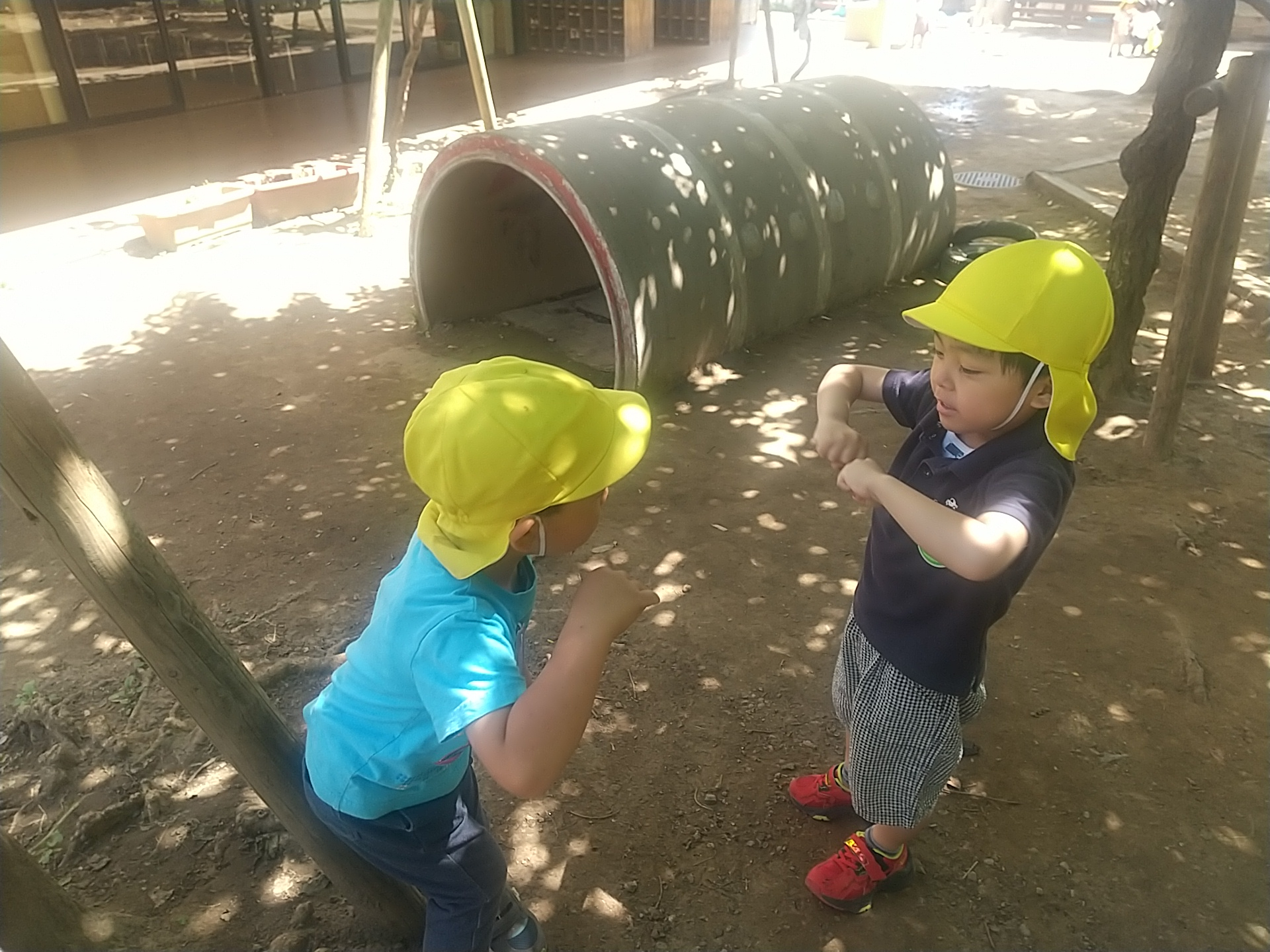 友達同士で「おはよう」と伝え合う姿や、ハイタッチで挨拶をする姿も見られます。言葉で挨拶をすることが苦手な子どもはハイタッチや背中を触る、名札を渡すなど自分なりの方法で挨拶を伝えます。
