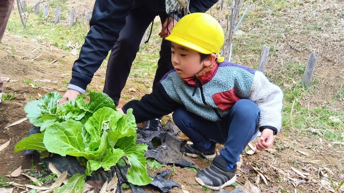 私たちは新羽どろんこ保育園と共に畑を所有しており、収穫チームは、その畑へ大根と白菜を収穫しに行きました。日々の畑仕事で畝作り、種まき、水やりをし、自分たちで育ててきた野菜です。「これ大根だ」と育った野菜を見て喜び、どうやったら土から野菜が取れるか、観察して収穫しました。野菜をどのように持ち帰るかを子どもたちに考えてもらうと、ほとんどの子どもは自分で持つことを選びました。