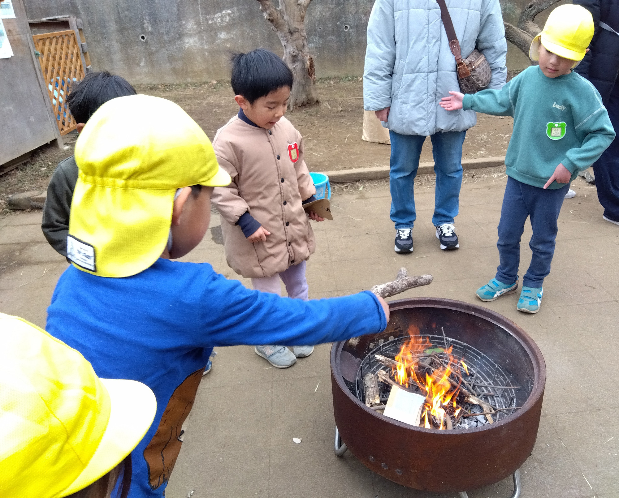 火起こしチームはまず、どのように火をつくるかを子どもたちに投げかけてみました。枝や薪は「集めたほうがいい」「散らして置いたほうがいい」という意見や、段ボールは「そのまま焼こう」「ちぎった方がいいよ」という意見など、子どもたちはアイディアを出し合っていました。火が起きたあとも、「風を起こしてみよう」「風を起こしたら火が止まっちゃうよ」と伝え合っていました。それに対して保護者の方もそれぞれ感じたことを子どもたちに伝えており、賑やかな雰囲気でたき火を囲みました。