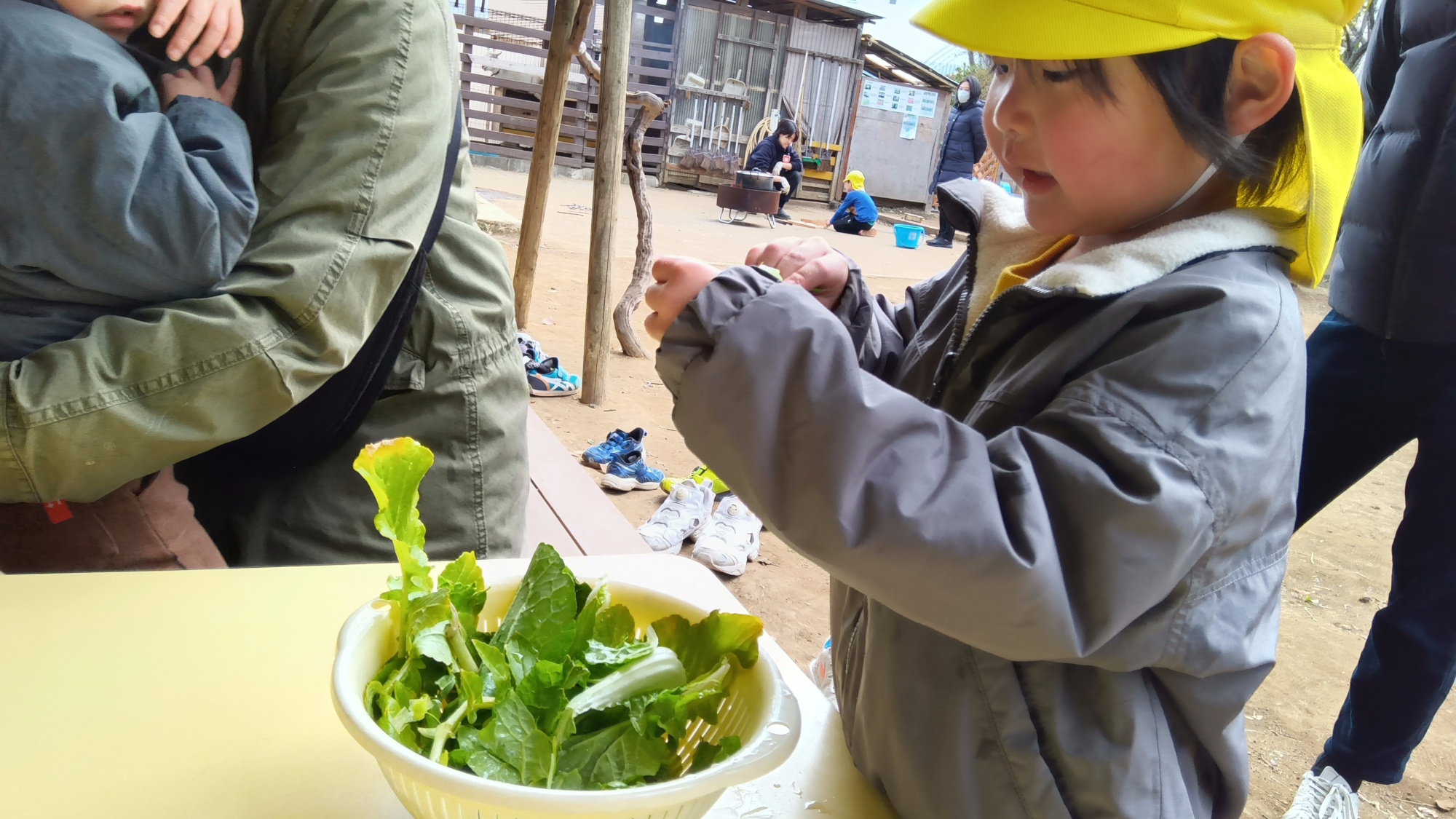 園庭で待っていた子どもたちは、収穫した野菜を見て「大根」「キャベツ」「ブロッコリー」とそれぞれ気付いたことを伝えたり、「これどうするの」「これ洗いたい」と次にどんな作業をしたらよいか考え、大人に伝えたりしていました。