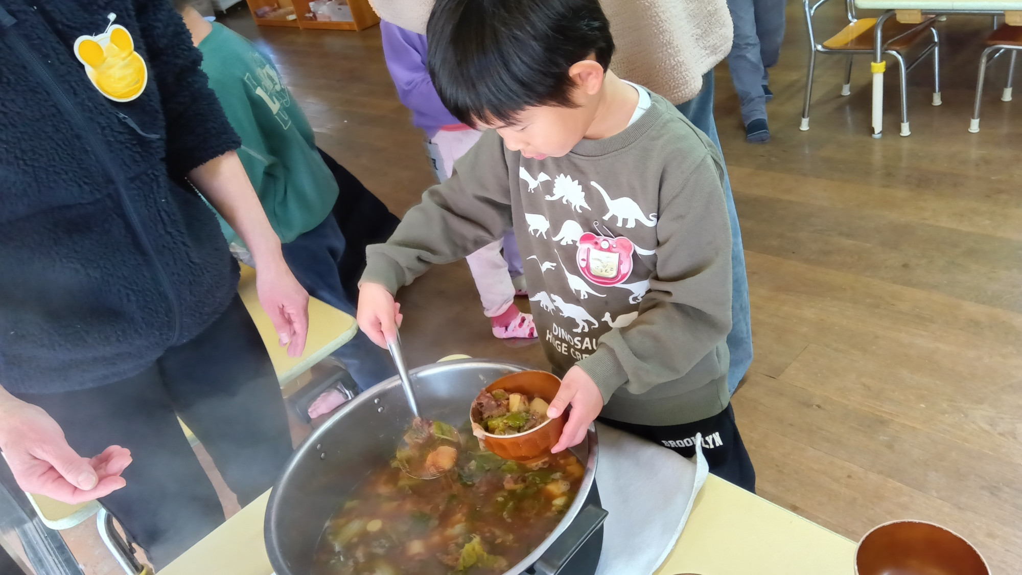 切り終えた野菜は、焚き火に鍋を置いて作っただし汁の中に入れ、最後に味噌を溶かして味噌汁にしました。野菜を鍋まで運んだり、味噌を溶かしたりすることも、「やりたい」と子どもたちが声をあげていました。味見をする大人に「味どうですか」と尋ねながら、味噌の量を調整して溶かし、完成するととても喜んでいました。味噌汁の配膳は、普段の給食と同じように子どもたちが自分で行ない、「お母さんの分もください」と家族の分も含めて2~3往復してテーブルまで運びました。「美味しいね」と家族で話しながら、自分たちで育てた野菜を味わっていました。