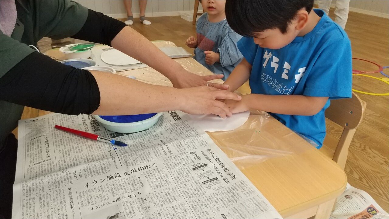 うちわづくりではぎゅっぎゅっと手形を押しました。手に絵の具をべったりつけるのはちょっと勇気がいるけれど、みんなはうまくできたかな?ほかにもスパッタリングという方法で模様をつけました。この手法は右手と左手の協調した動きが必要です。ぎこちない動きの子もいましたが、みんな一生懸命取り組み、上手に模様をつけることができました。