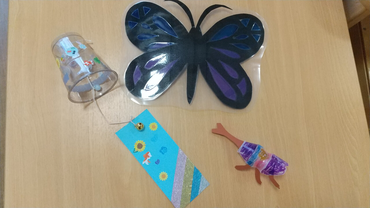 4つすべて完成しました!お母さんやつむぎの職員に「おうちに飾る~」と言って自慢げに見せてくれて、満足感や達成感を感じられた体験学習になりました。制作活動では手先の巧緻性(手先の器用さ)の向上を図ることや想像力、考える力をつけることができます。そのほかにも完成させることで達成感を感じ、自信にも繋がります。