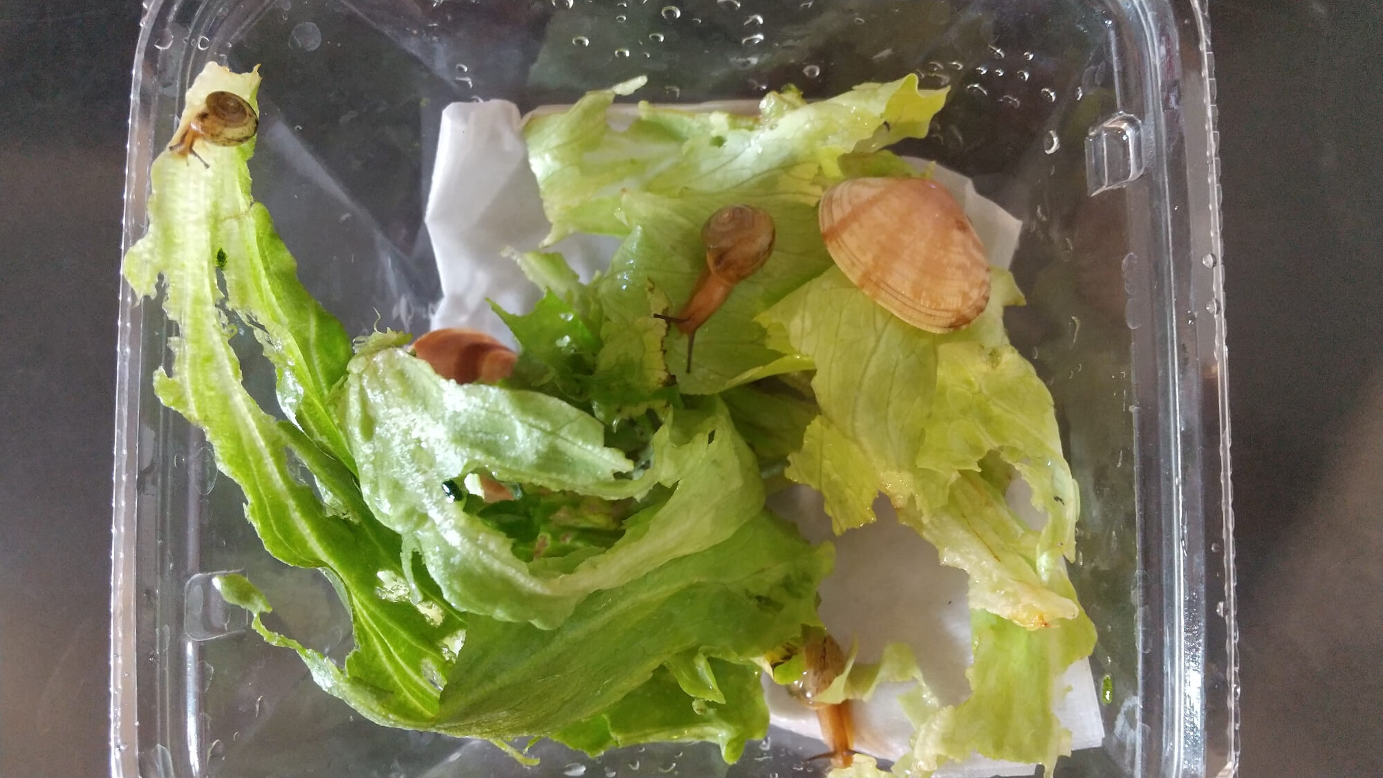 カタツムリは卵を産んで、3代目になりました。職員が餌になるキャベツの外葉をもらってきて大切に育てています。