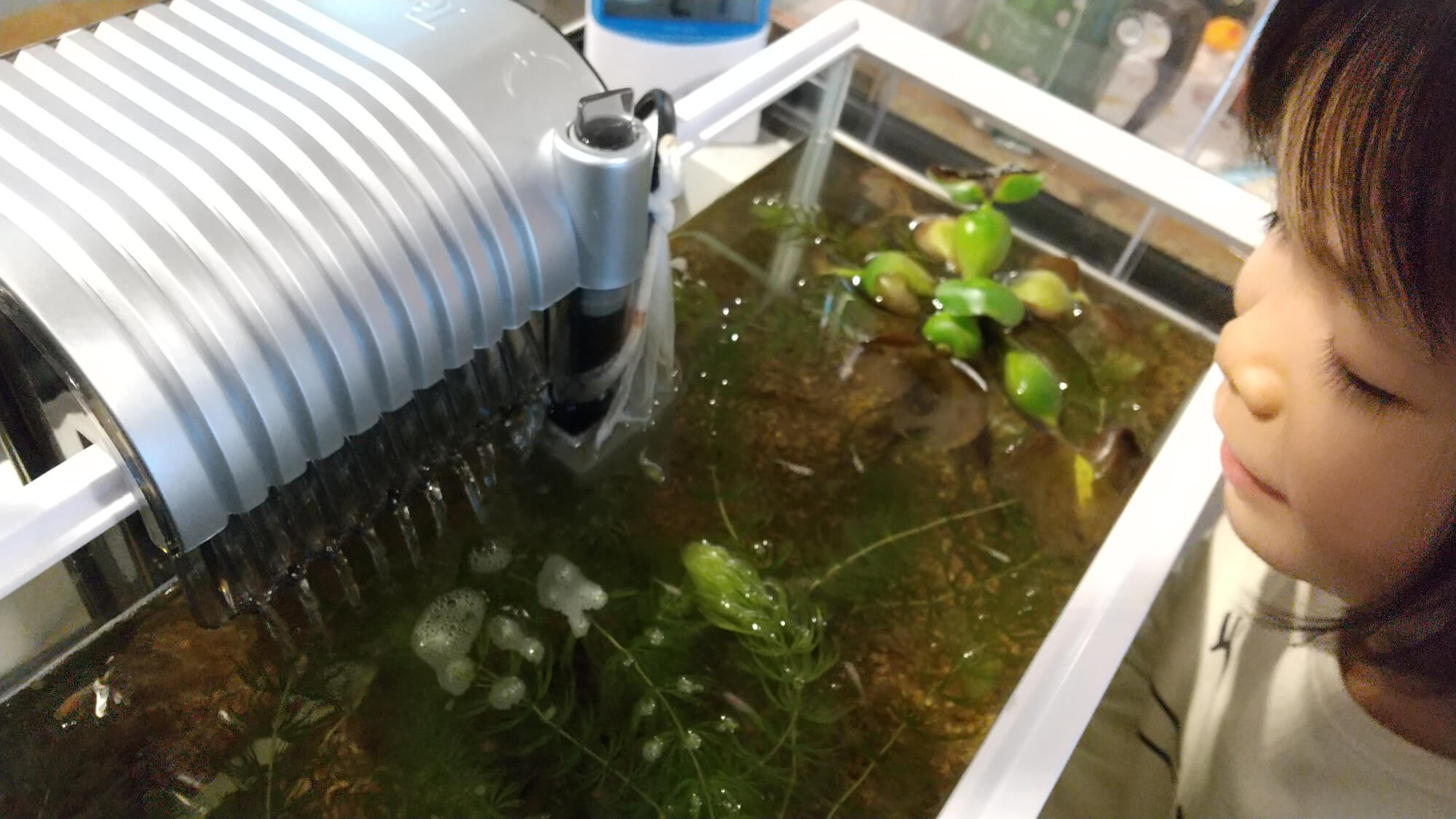 メダカやヌマエビに餌をあげるのを楽しみにしている子どももいます。