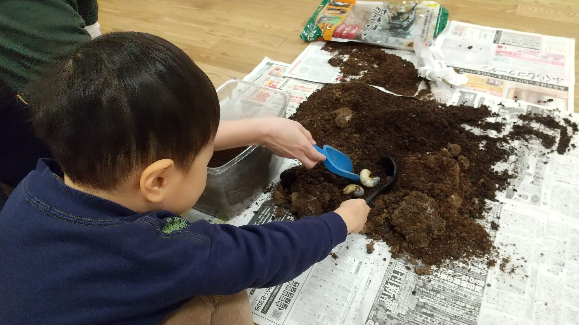 今、カブトムシは幼虫です。土を食べてころころと大きくなりました。糞でいっぱいになるとつむぎに通っている子どもたちが土を入れ替えてくれます。少しずつ大きくなっている様子を見て、「大きくなったね」「このあとさなぎになるよ」とカブトムシの幼虫が育つ様子を楽しんで見ています。