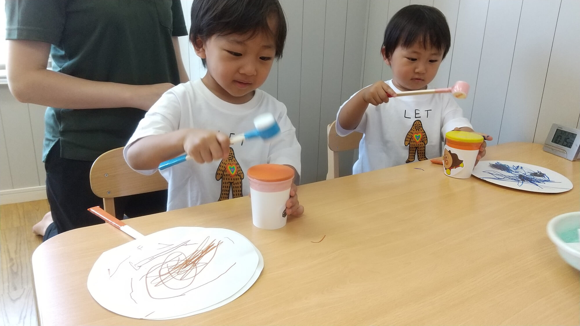 まずは、阿波おどりにつかう「うちわづくり」と「たいこづくり」から。好きなシールや柄を選んで、好きな色で絵を描いて、自分だけの道具をつくります。