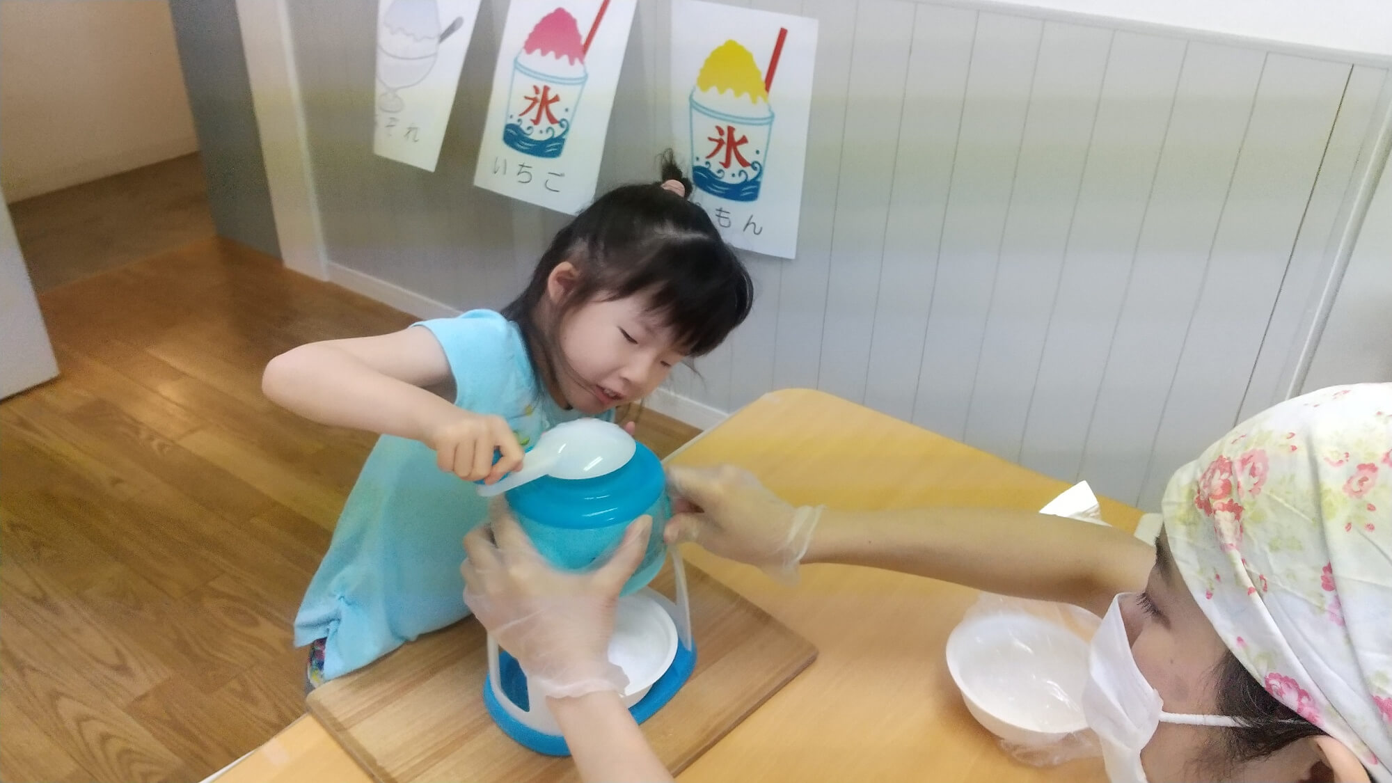 最後は、お楽しみのかき氷。手回しのかき氷機をつかって、力いっぱい削ります。