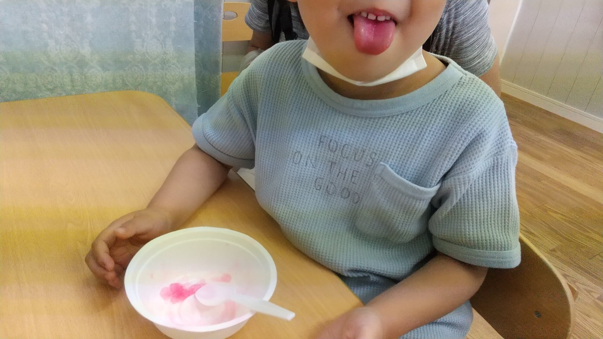 イチゴ味のかき氷を食べたら、舌が真っ赤でした。