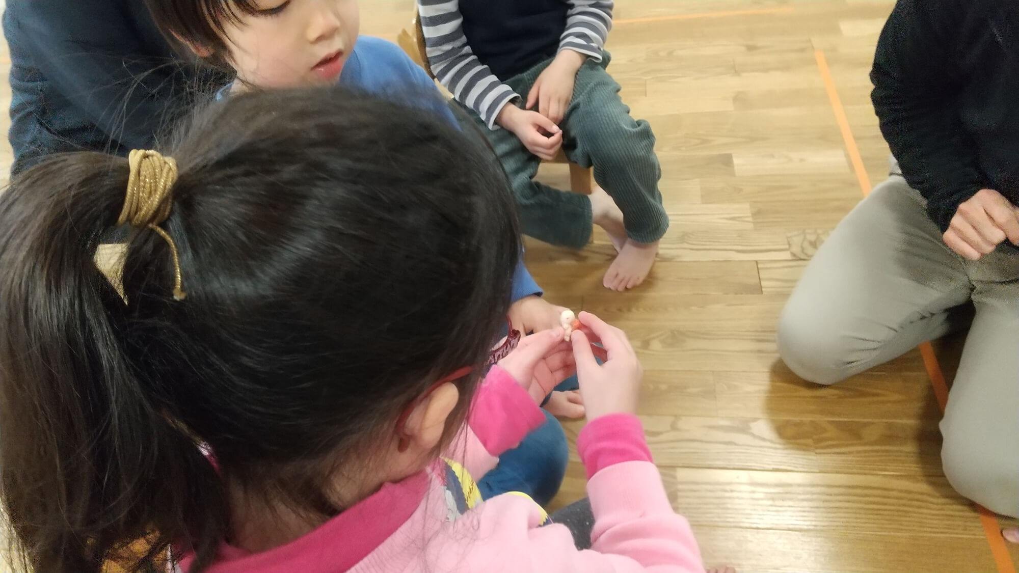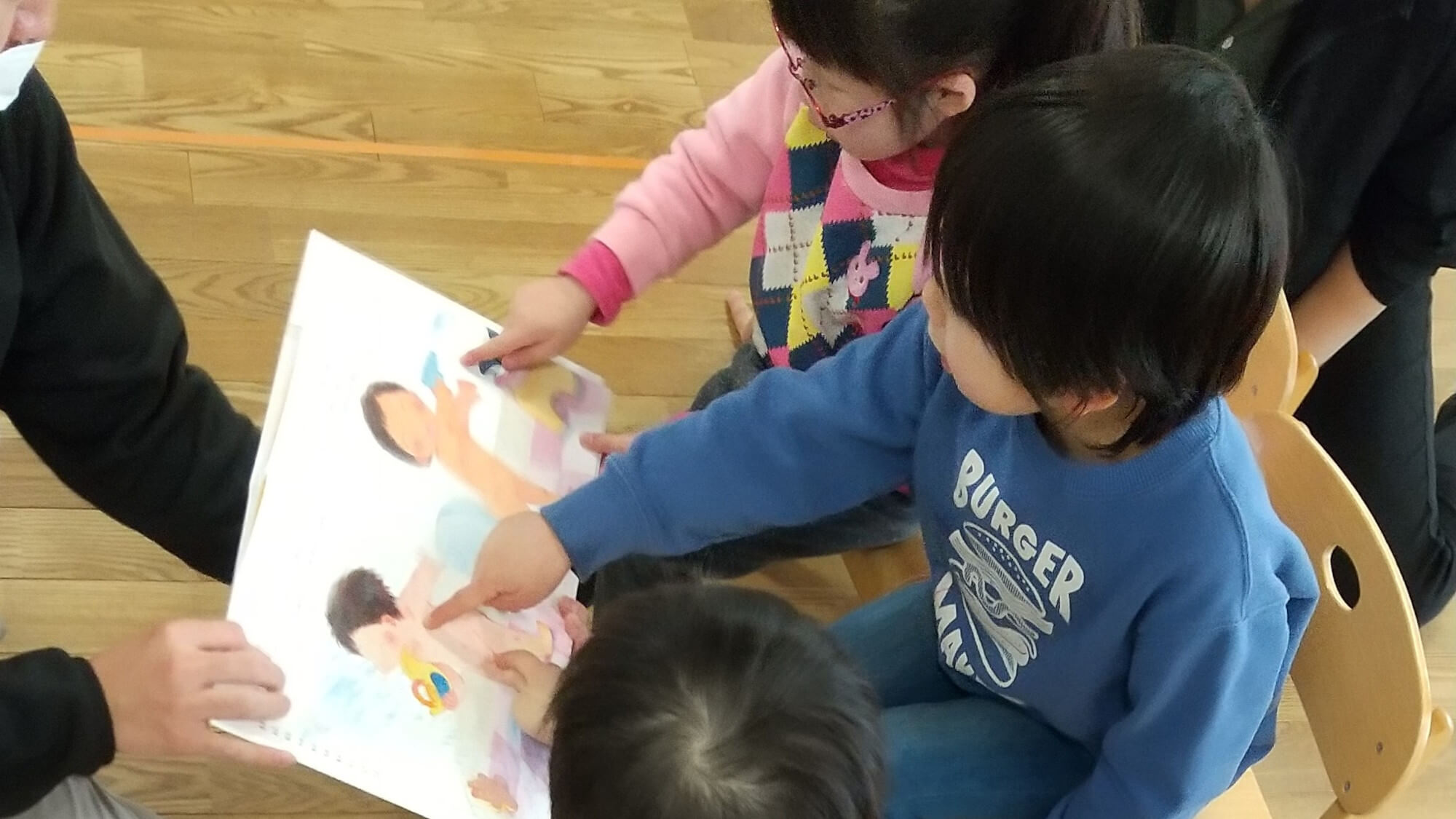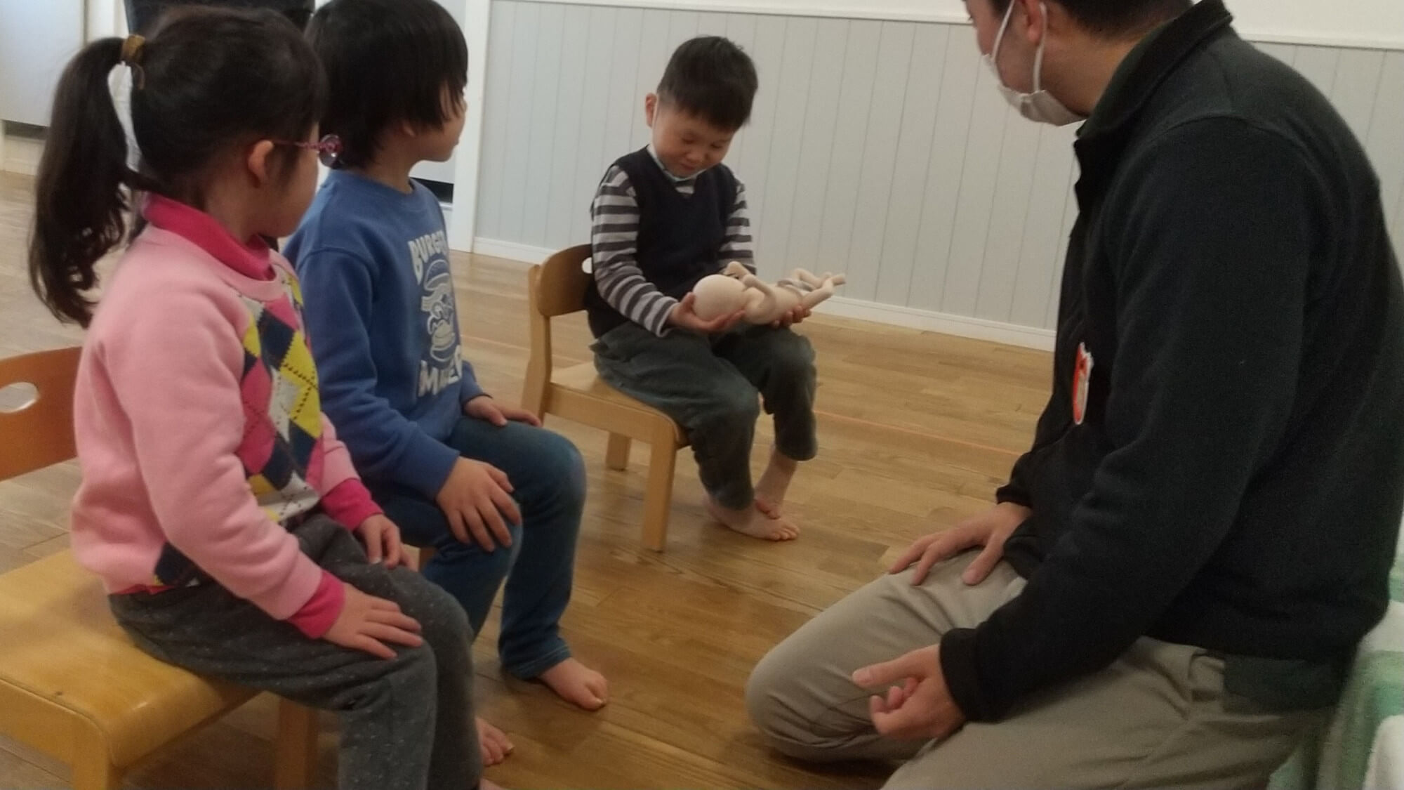 まずは、絵本を通して、赤ちゃんがどのようにお母さんのお腹の中で育っていくのかを学びます。赤ちゃんはお母さんのお腹の中で大きくなっていくこと、栄養はへその緒を通じてお母さんからもらうこと。