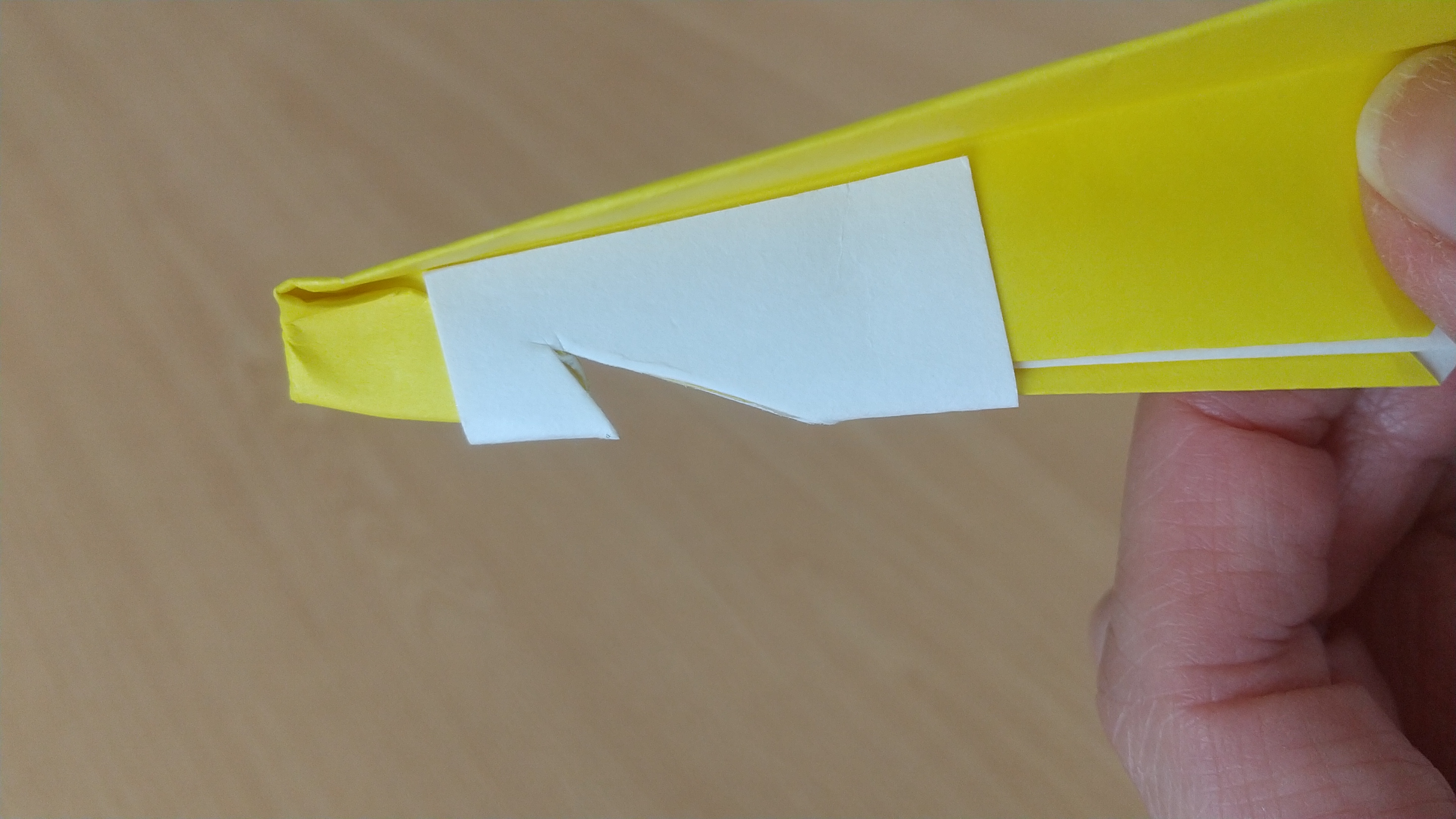飛行機の持ち手の先端部分に、画用紙を両面テープで貼り、ハサミで切り込みを入れます。