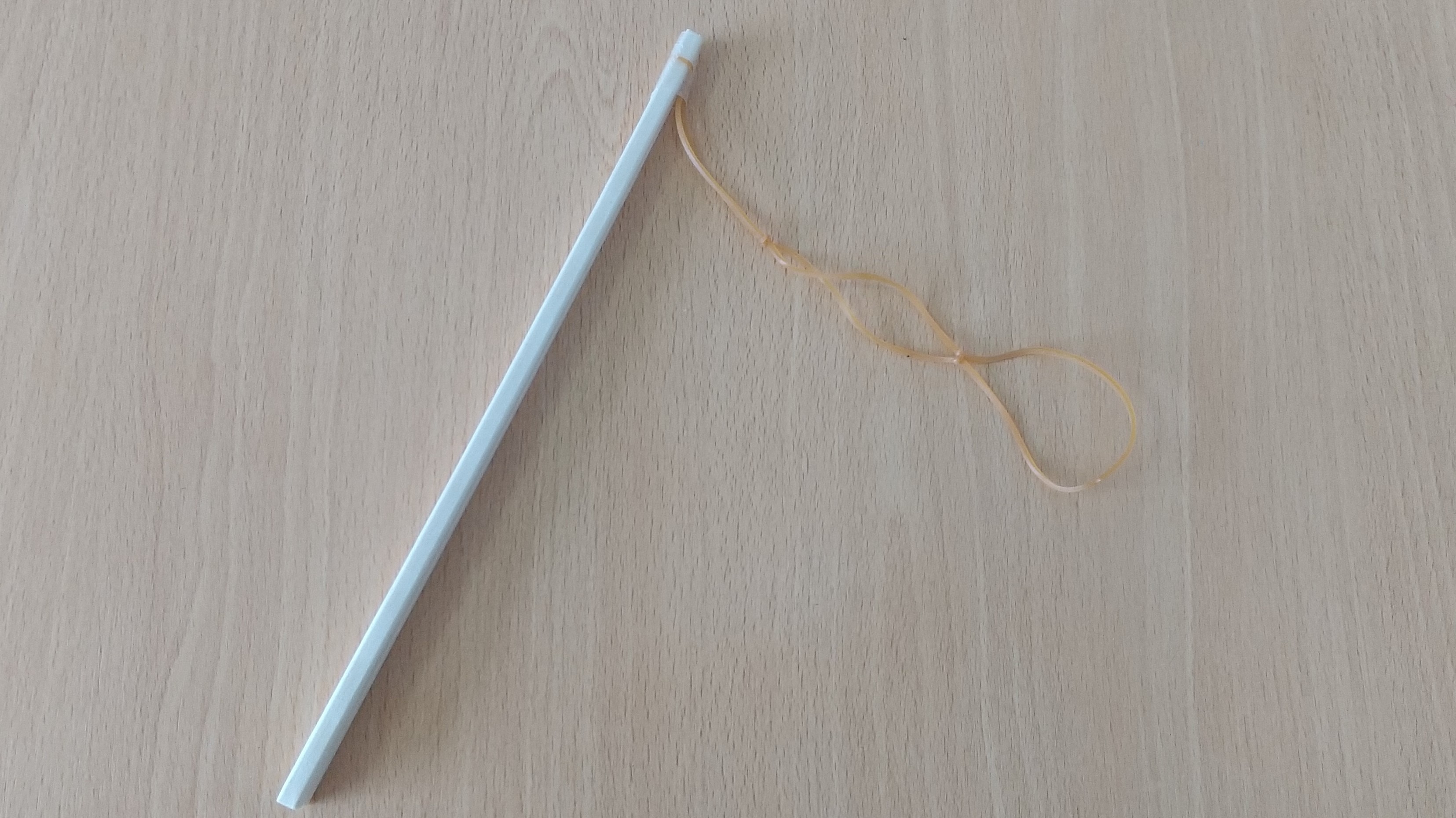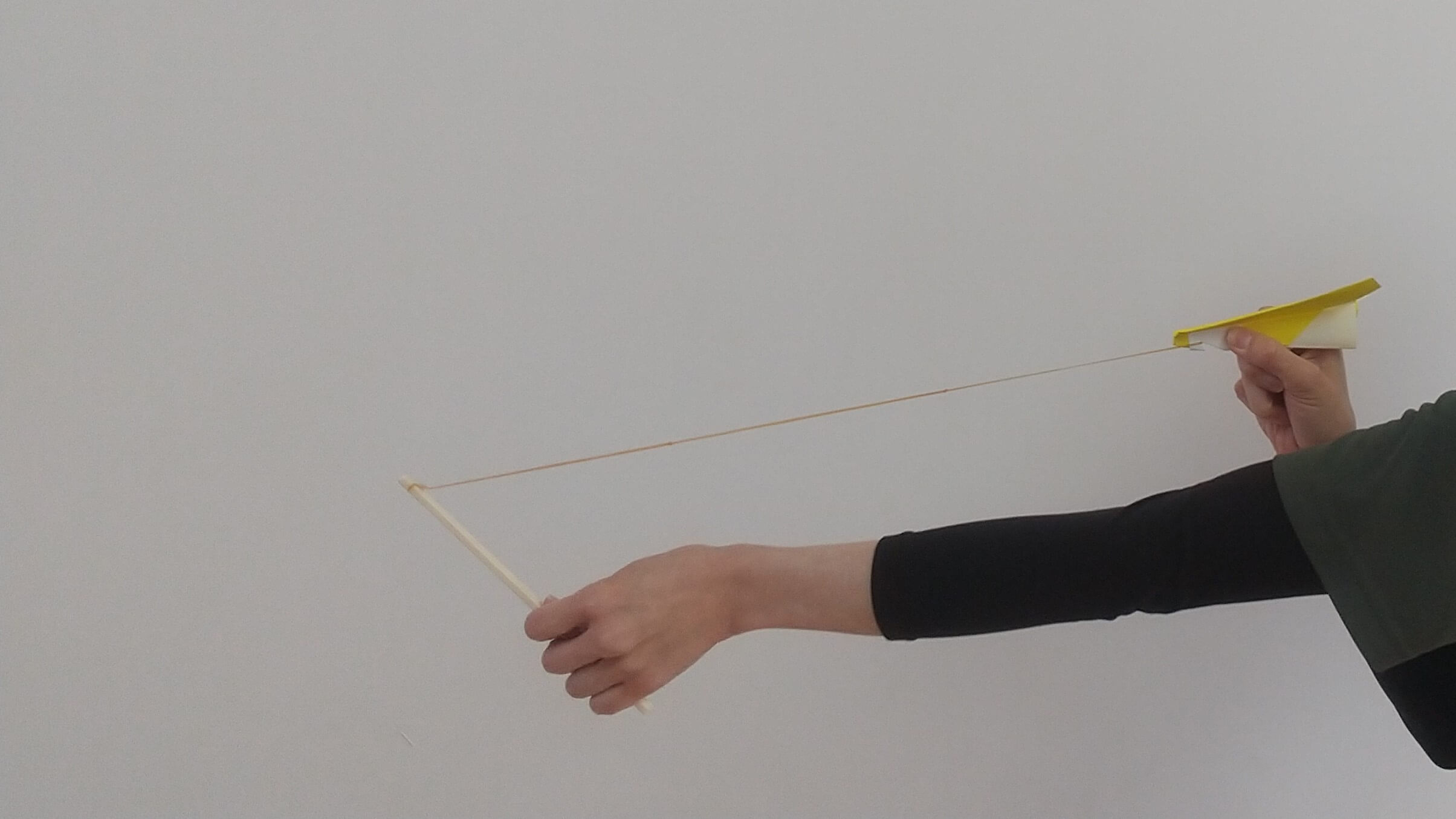 輪ゴムを、飛行機の切り込み部分に引っ掛け、棒と飛行機が離れるように引っ張ります。しっかりと輪ゴムが伸びたところで、棒は持ったまま飛行機を持った方の手を離します。ビューンとすごい勢いで飛行機が飛んでいきます。