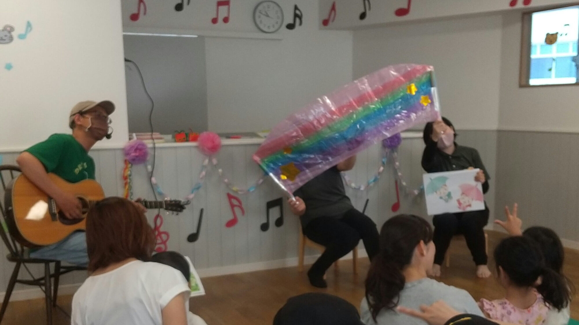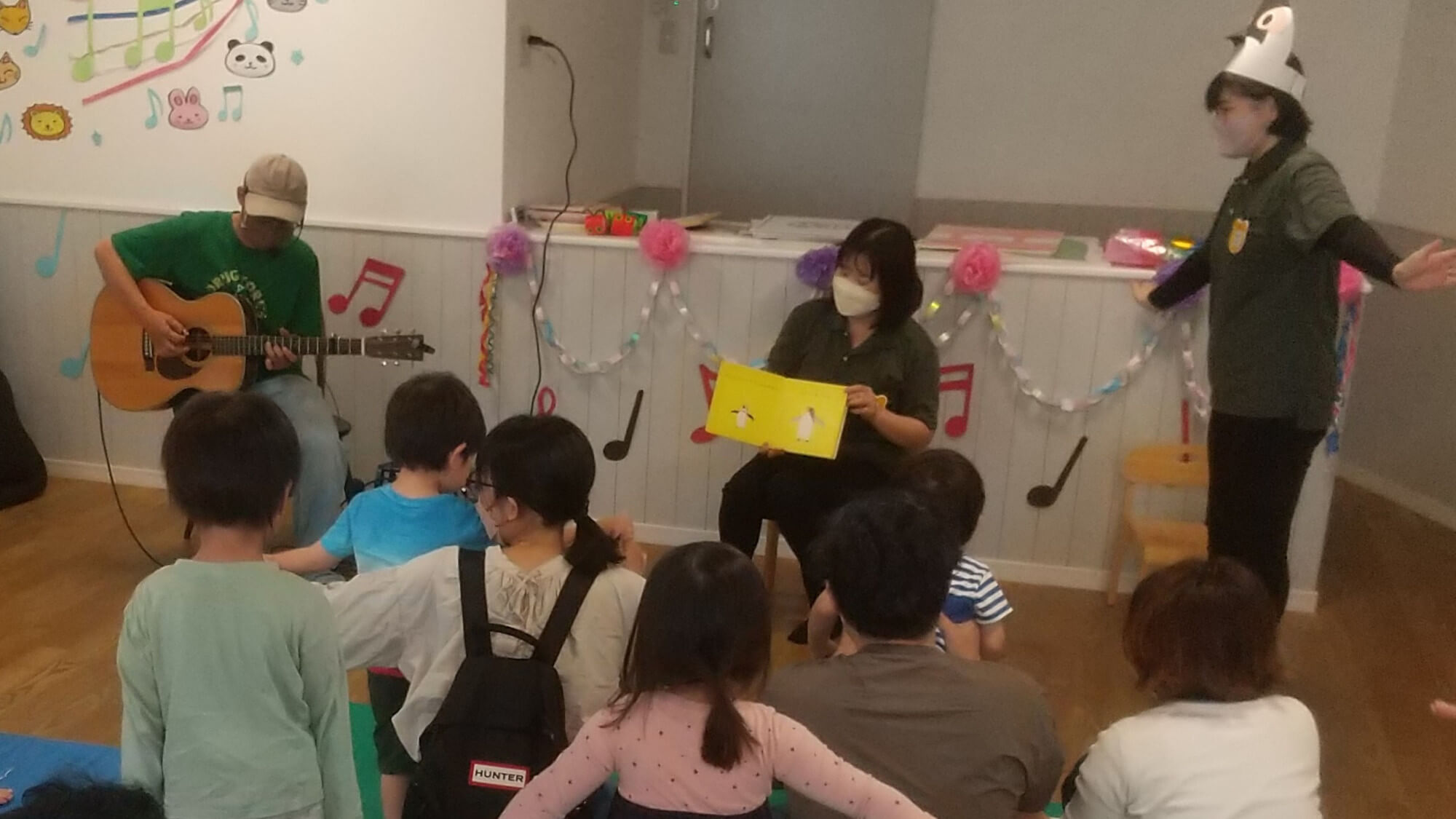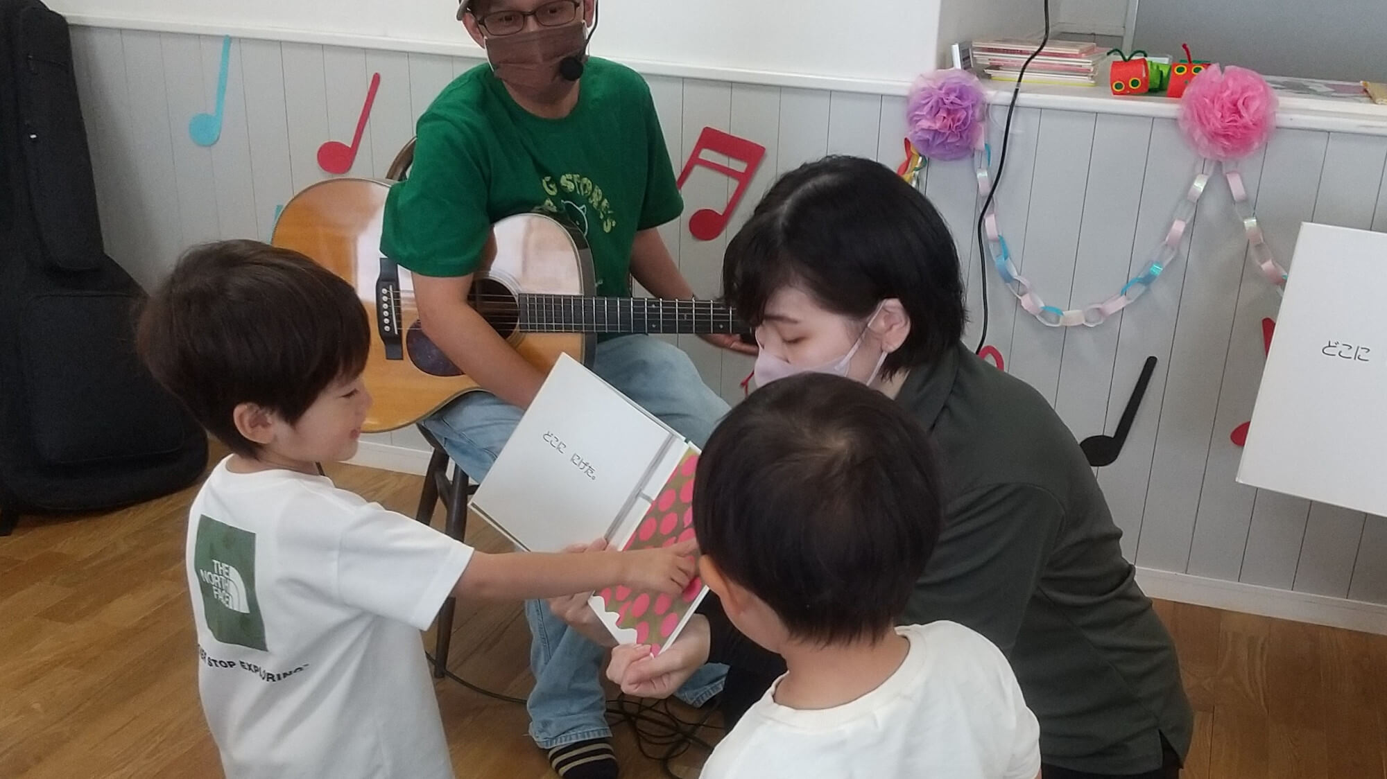 6月の体験学習では、絵本歌い屋のまっとうさんによる、絵本の歌い聞かせ体験です。まっとうさんは、児童館や子育て支援施設で、絵本を題材にした歌を歌う活動をされています。