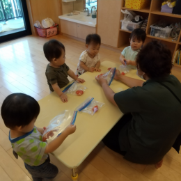 アメンボやカワエビなどの生き物、水の感触、川の流れでつるつるになった石など、興味の対象がたくさんあり、あっという間に終わりの時間になりました。