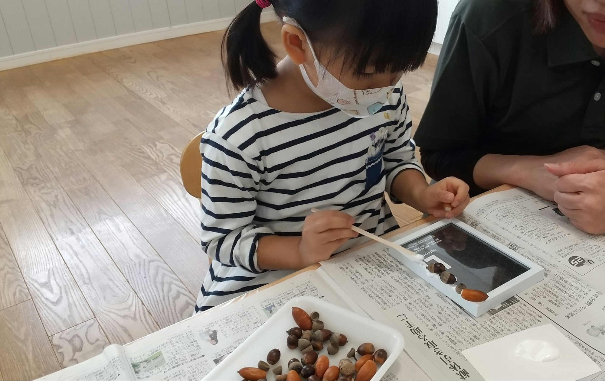 杉並区にある児童発達支援事業所、発達支援つむぎ 荻窪ルームでは、子どもたちに普段経験できない体験を提供するため、月に1回体験学習の時間を設けています。今回の体験学習は、どんぐりを使った制作活動です。