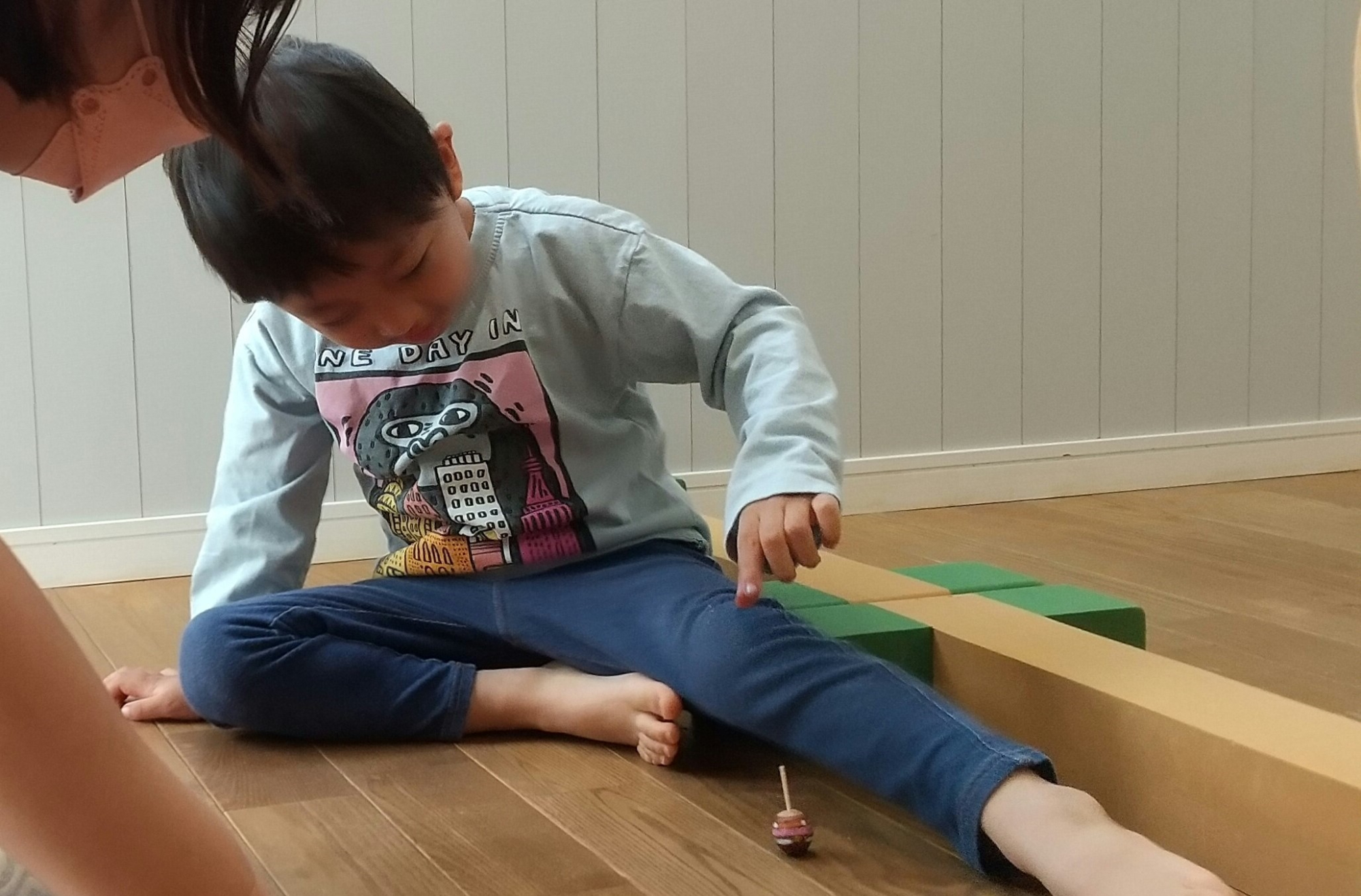 早速、つくったこまを回して遊びます。上手に回すためには、指でつまんで力を加減する必要があります。何度も繰り返し回してコツを掴んでいきます。