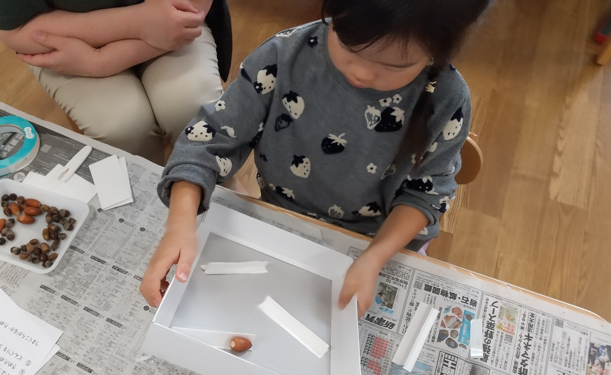 迷路は、どんぐりがどのように転がるか、考えたり試したりしながら、自分でコースを作っていきます。コースの角度によっては、途中で止まったり、勢いよく転がり過ぎてコースを外れたりしてしまいます。試行錯誤しながら作っていきます。