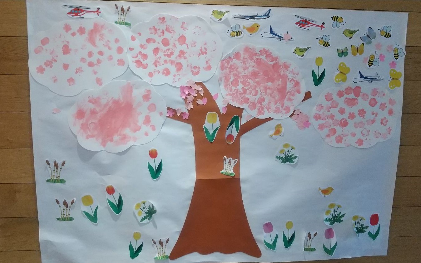 「絵の具がひやっとして気持ちいい。」、「みてみて、こんなにいっぱい花が咲いたよ。」絵の具の感触を楽しみながら、友だちと協力しながら一つの桜の木を作ります。