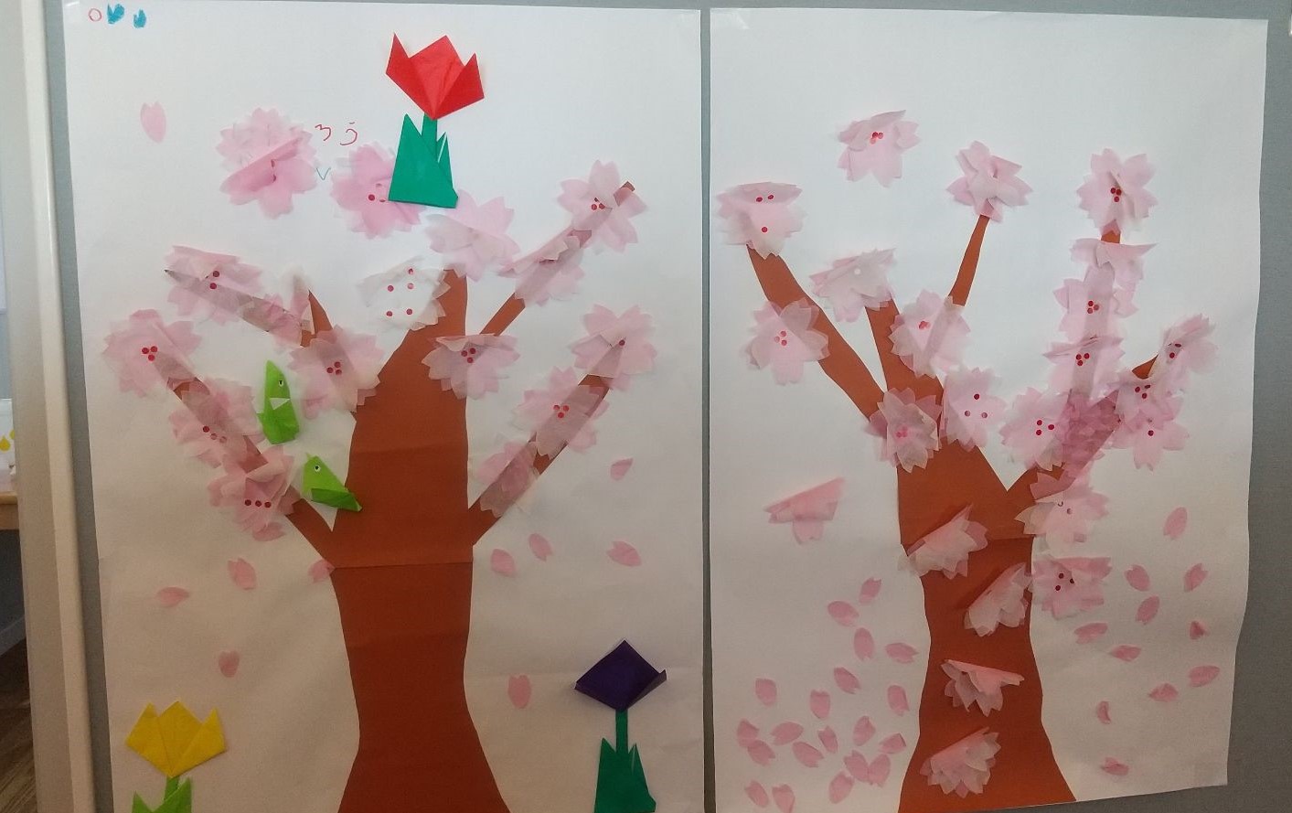 次の作品は、繊細なお花紙を貼り合わせ、芯に小さなシールを使い、桜を作りました。力が入り過ぎてしまうと破れてしまうので、慎重に取り組む必要があります。