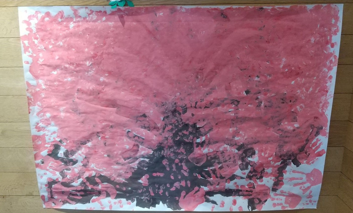 最後は、絵の具を用いたダイナミックな桜です。筆を使って木の幹を描いた後は、赤と白の絵の具を混ぜてピンクの絵の具を作ります。色味の違うピンクの絵の具を思い切り手のひらにつけて、ペタペタと桜の花を咲かせていきます。