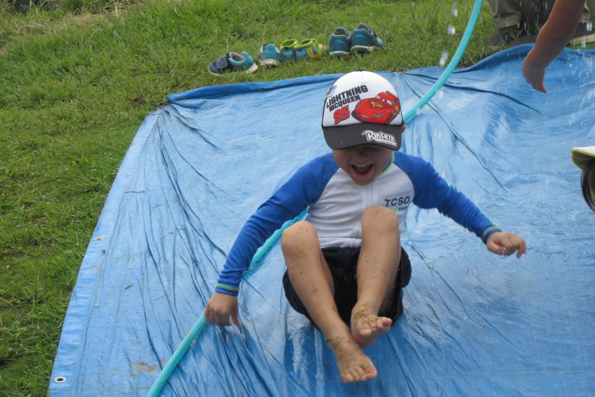 動物たちと遊んでいる中、後ろを振り返ると、楽しそうにウォータースライダーを楽しむ子たちの姿が。あっという間にみんなが集まってきて、大人が言葉をかけなくても自然と順番に並びすべります。最初はすべることを躊躇していた子どもたちも、ほかの子の楽しそうな姿に背中を押され、最終的には全力で楽しんでいました。