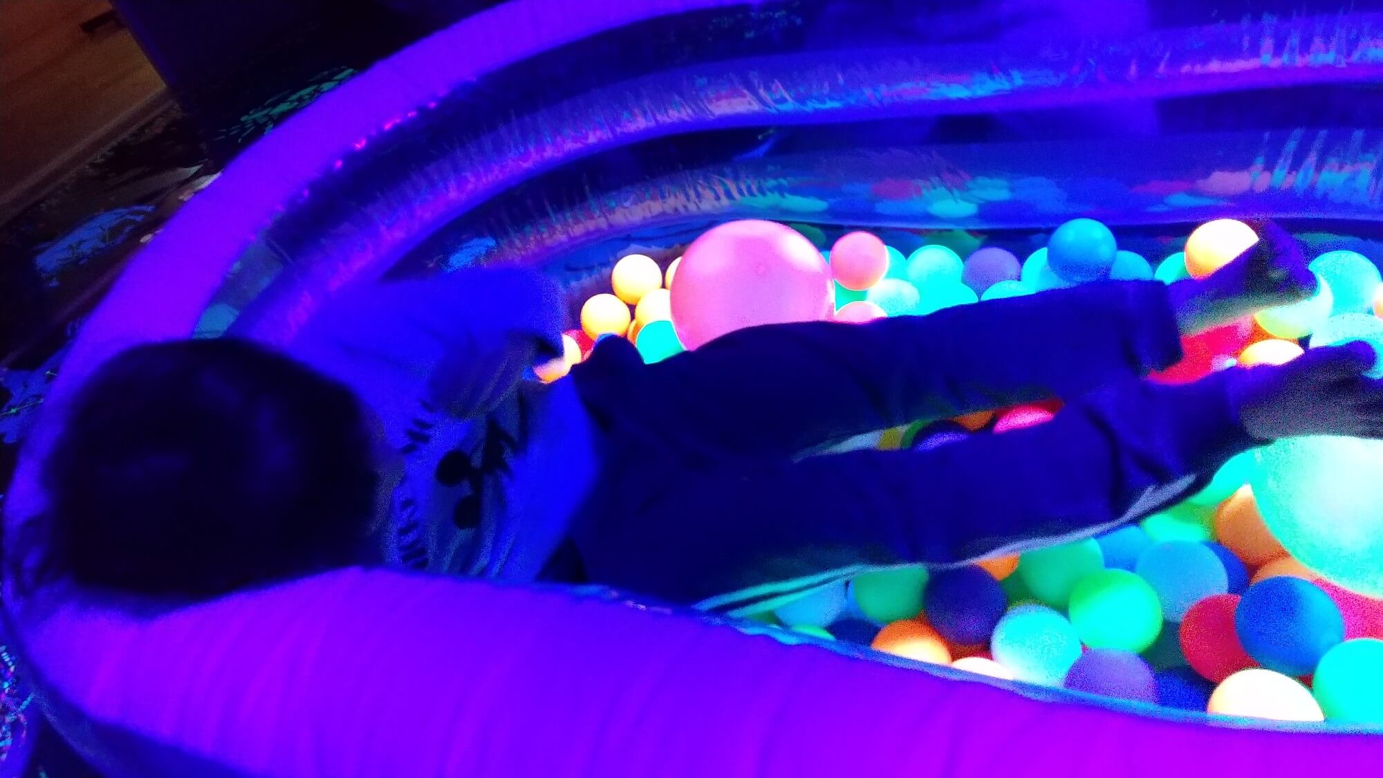 子どもたちはいつもと違う部屋に少し戸惑いつつも、興味を持ち遊び始めていました。光るボールプールはやはり大人気で、寝転がってくつろいでいる子や、ボールをなげてダイナミックに楽しむ子など、それぞれで様々な遊び方をしていました。