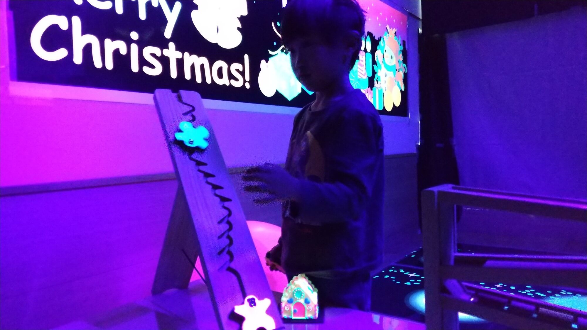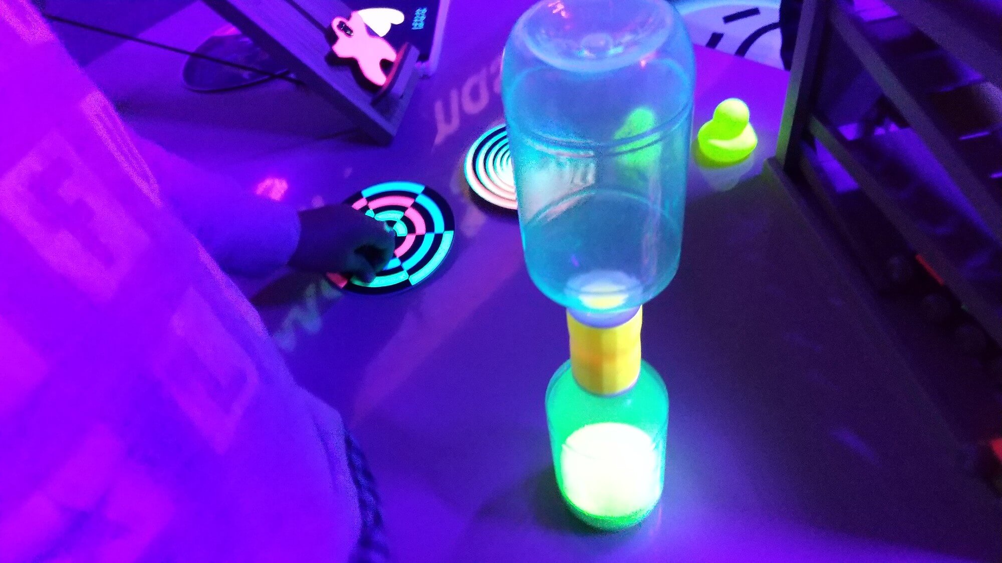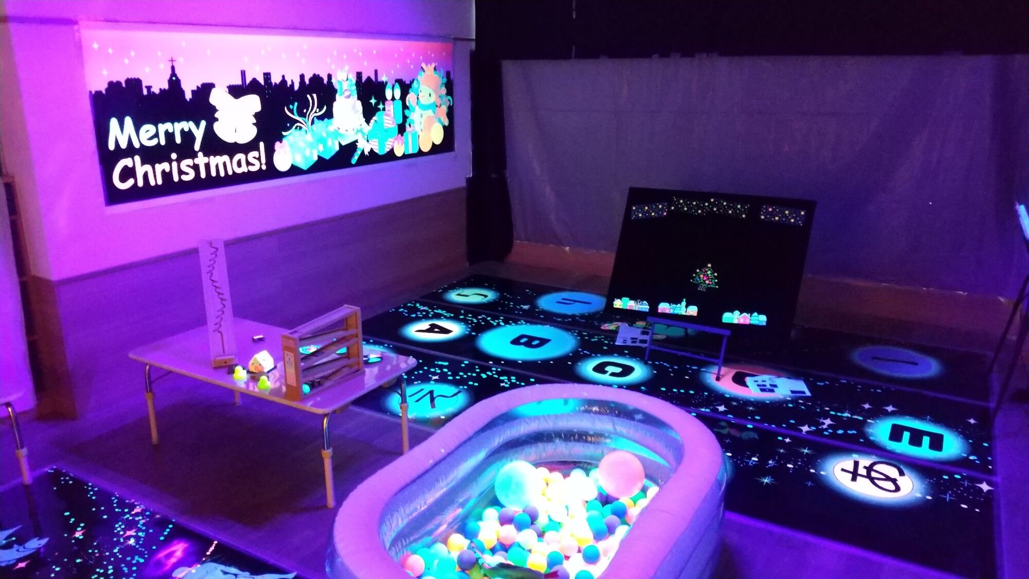 前年度もお世話になったNPO法人「スヌーズレンを普及する会」様より、たくさんのスヌーズレングッズをお借りして、ブラックライトを使用したブラックルームをつくりました。