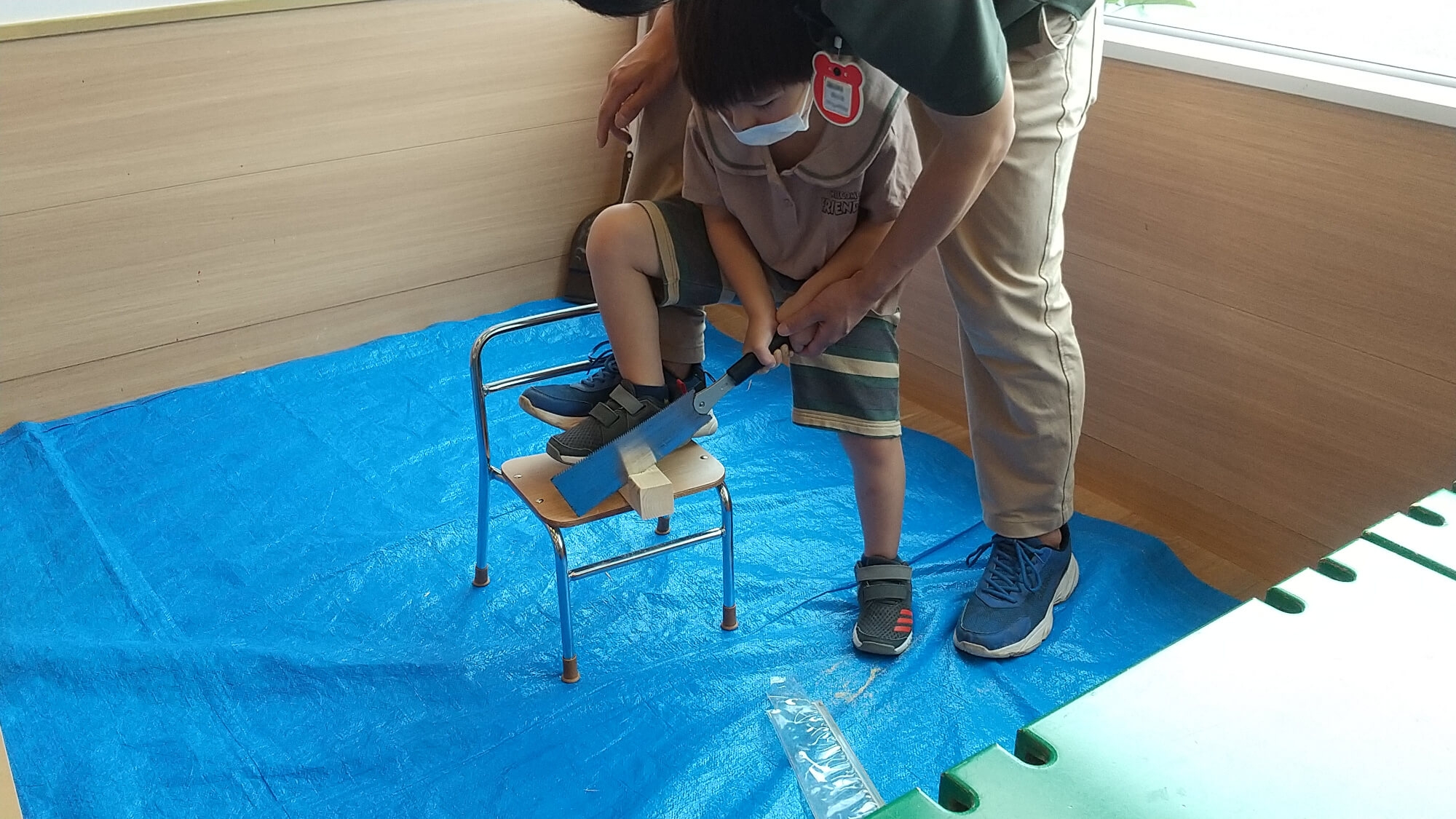 子どもが職員の手を借りながら角材をのこぎりで切る様子