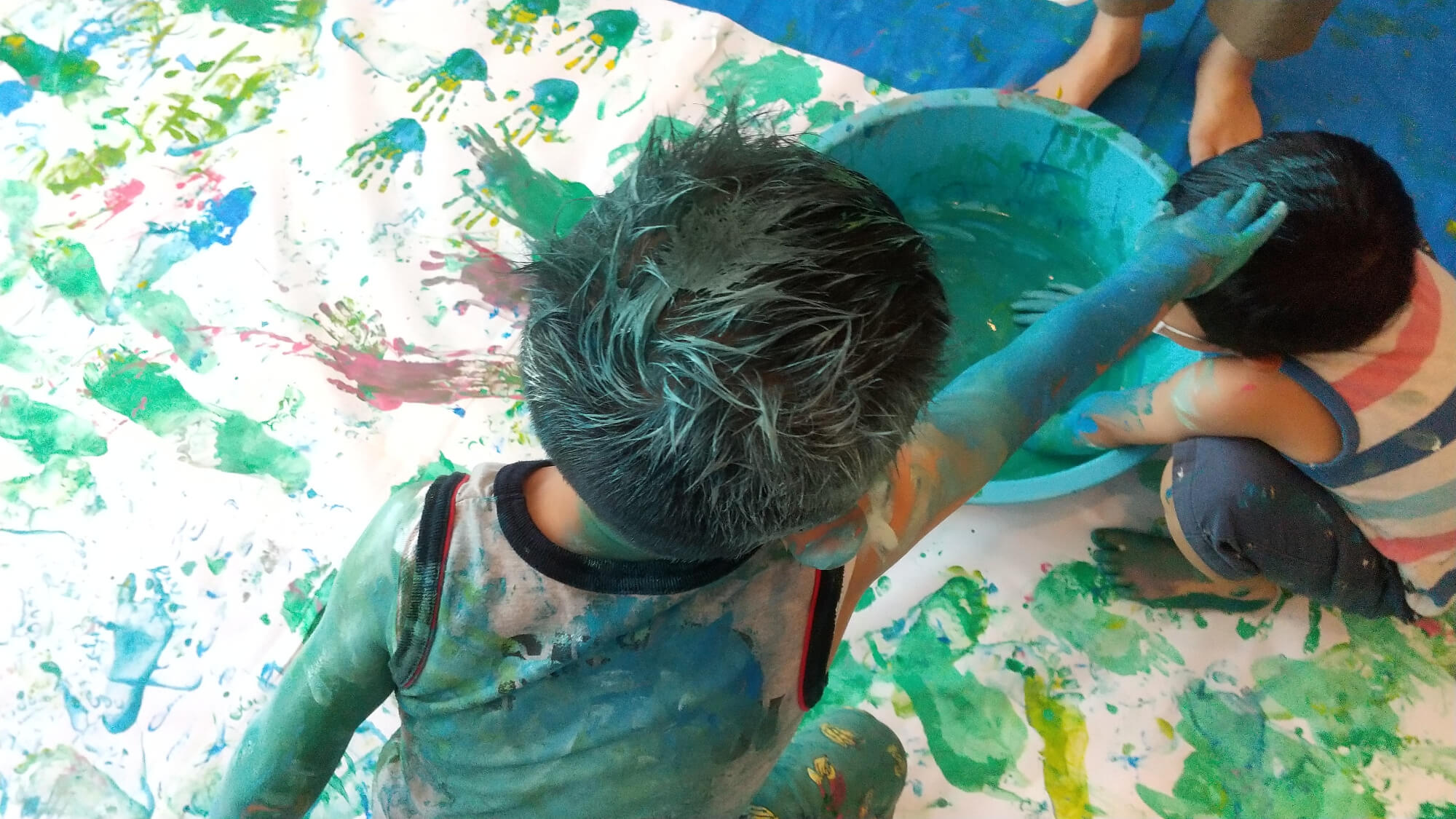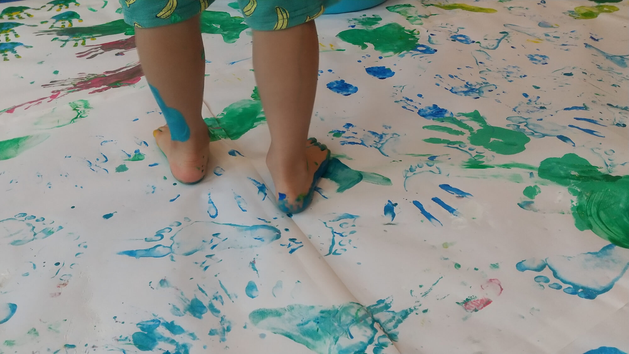 絵の具に触れる時のリアクションは、一人ひとり違います。ドキドキしながら指先をそっとつける子、トレイに手のひらや足の裏を躊躇せずにつける子、他児の表現している様子を見てやっと絵の具に触れる子等、様々でした。