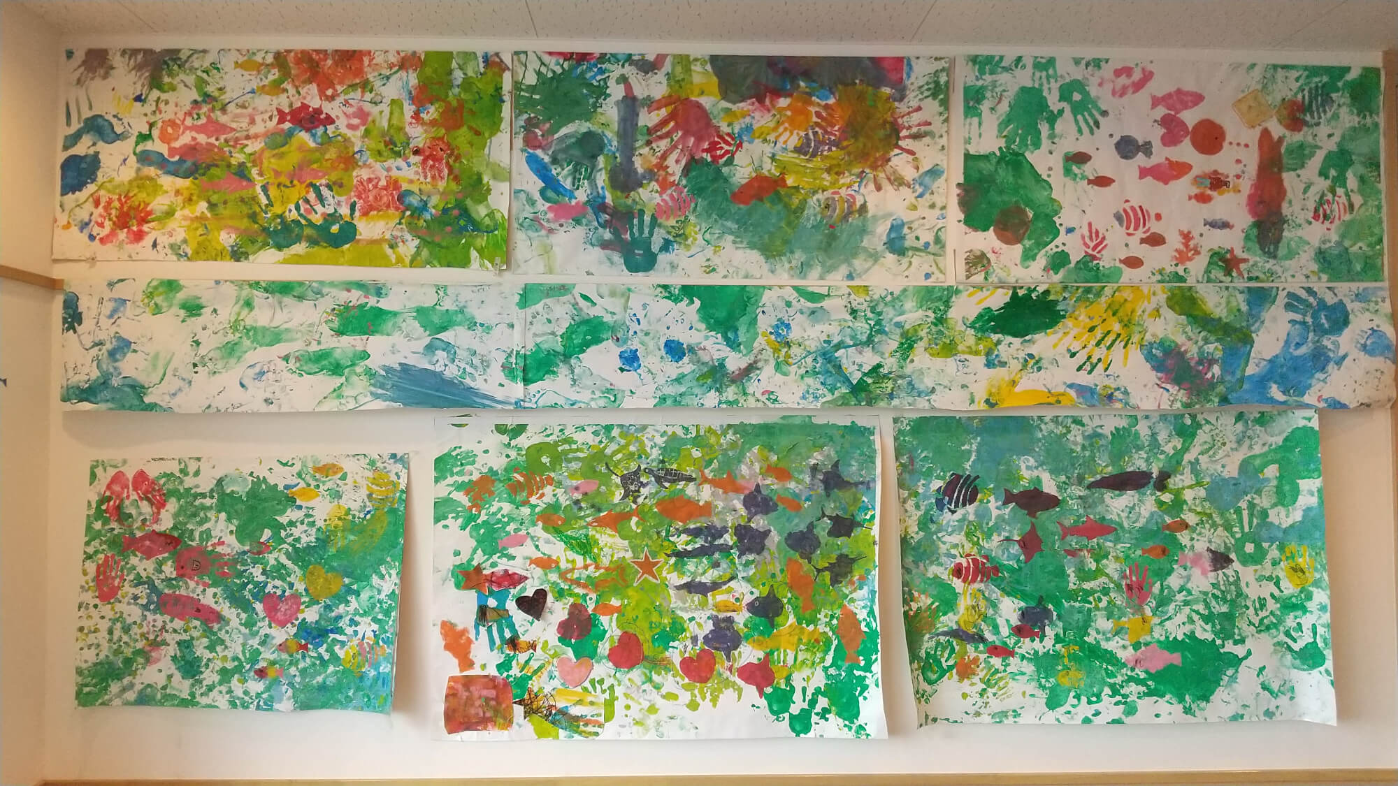 みんなが大きいキャンバスに描いた作品は、分割し、別活動でステンシルを行って水族館を作りました。体験が終わった現在もつむぎ桶川ルームを楽しく彩っています。