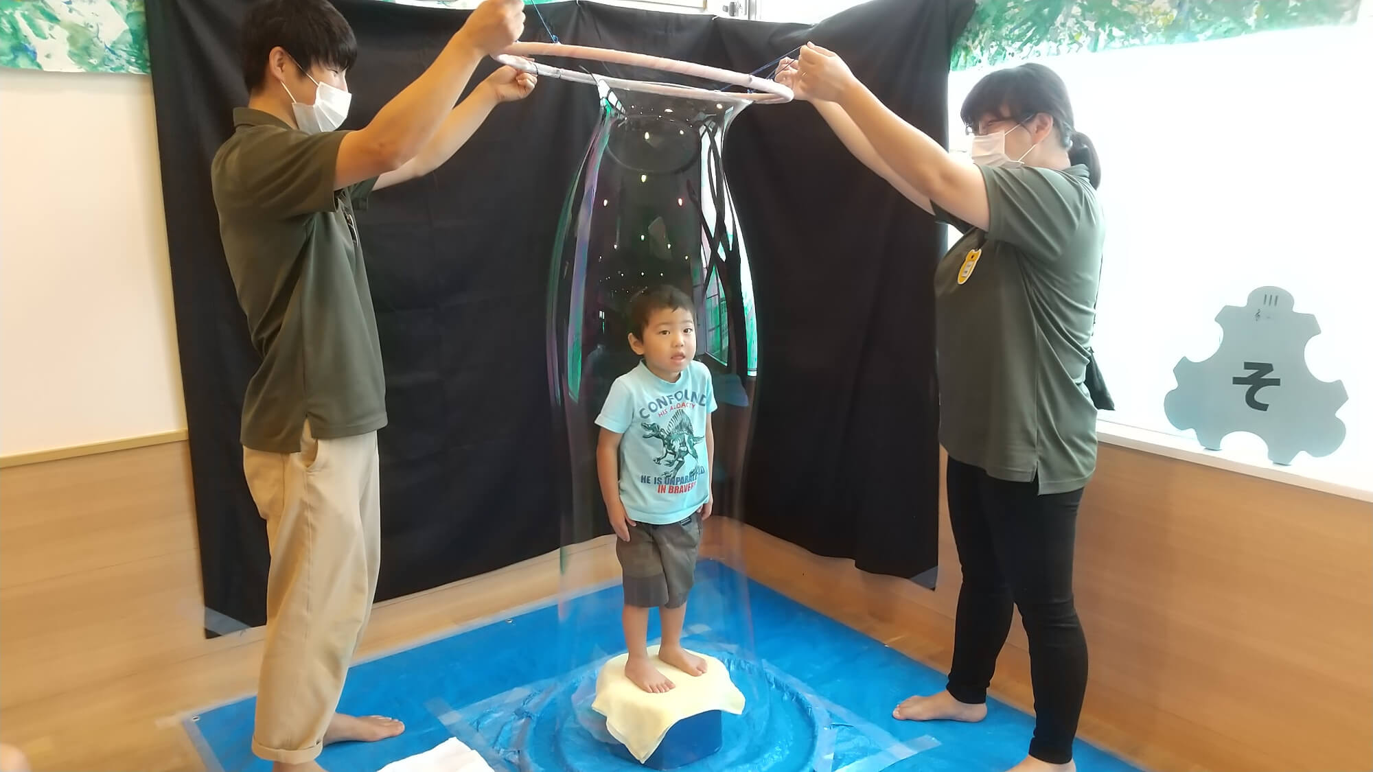 製作が終わった友だちから、本日の目玉「巨大しゃぼん玉」の中に入る体験をしました。大きなしゃぼん玉に包まれると、大人からは歓声が上がり ました。中の子どもたちは少し驚いたような、緊張したような表情でした。