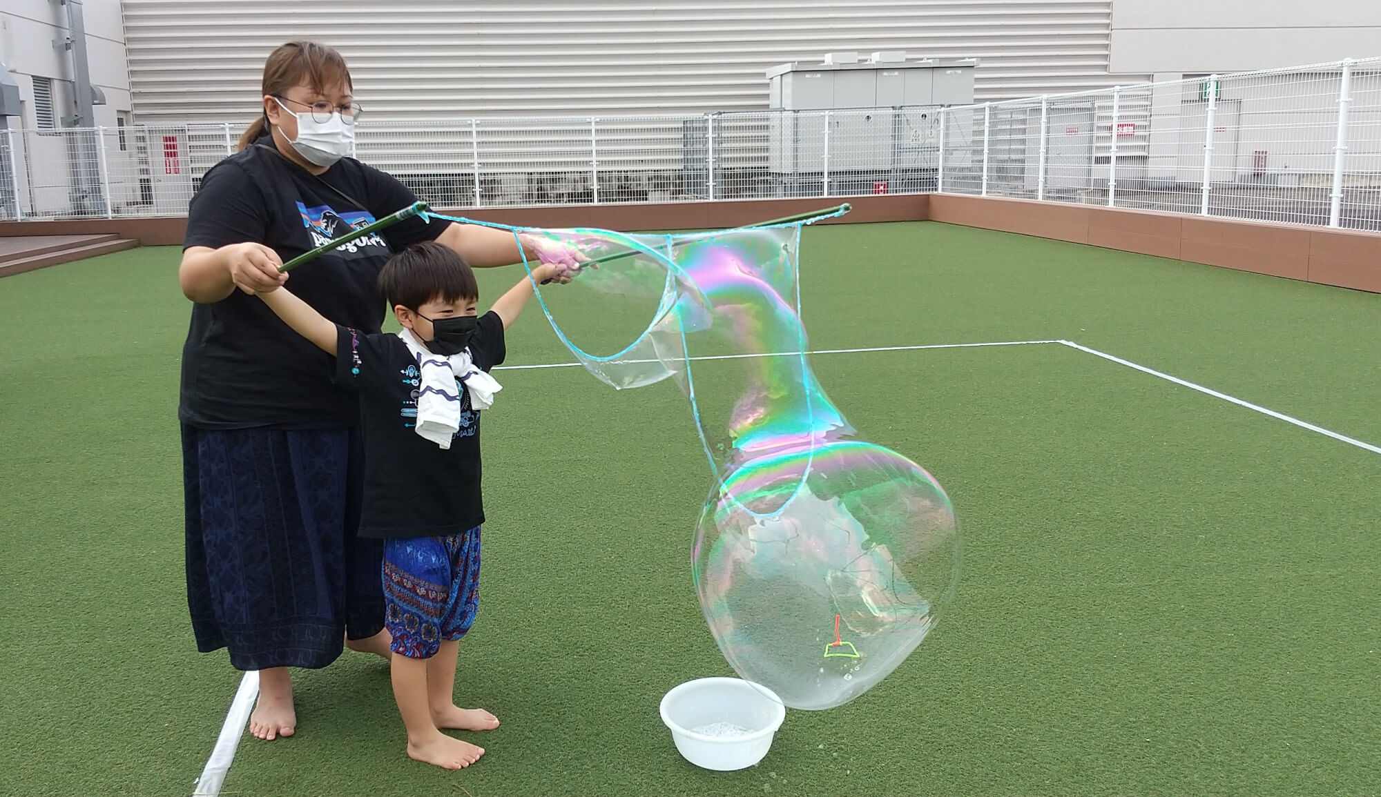 …とみんなも夢中です。特にお父さまたちは、大きなしゃぼん玉を作ろうと夢中になって楽しむ様子が印象的でした。