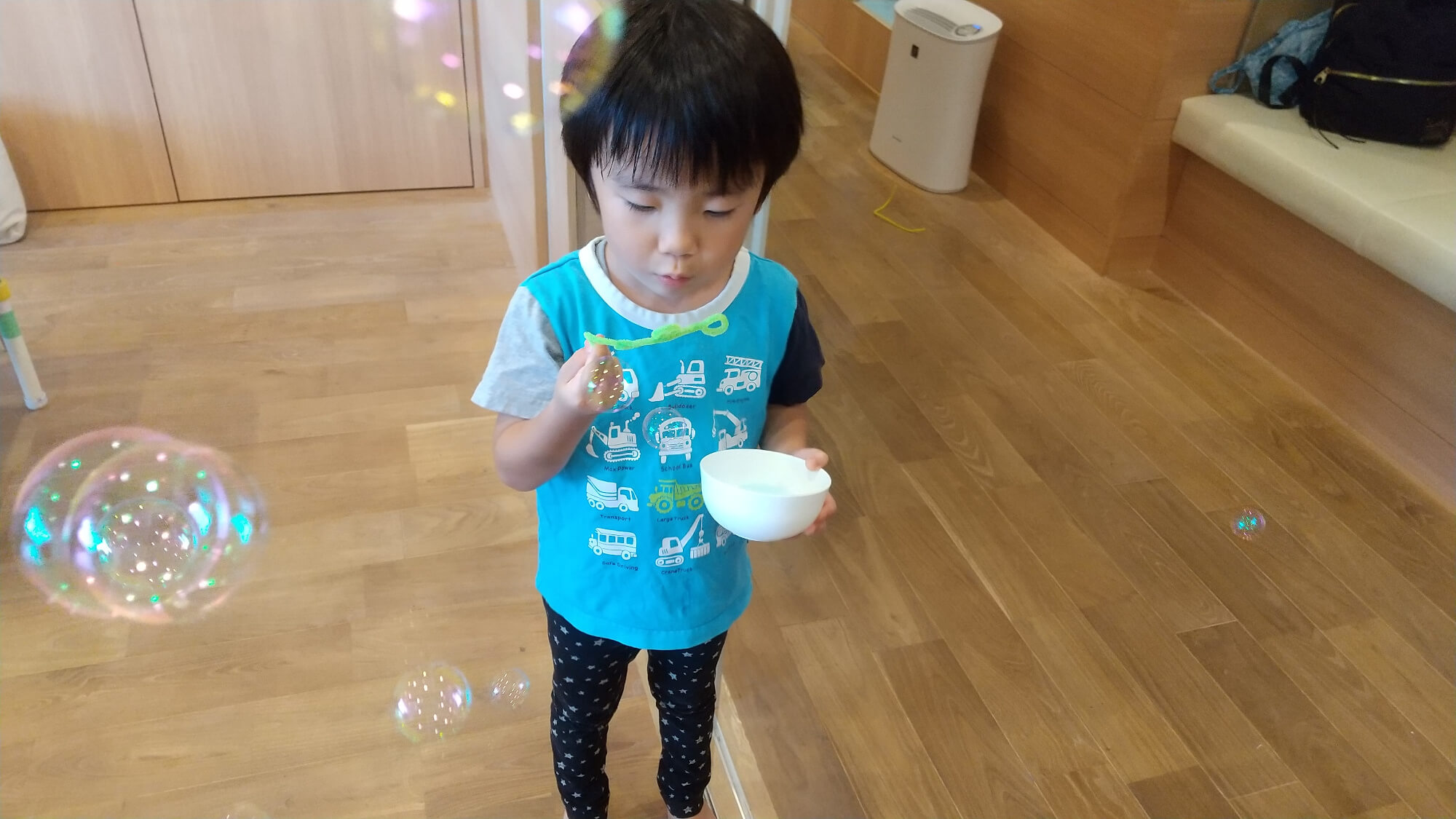 そんな大人たちの様子を見て、子どもたちもじっと風を待ってみたり、様々な道具を手にしてみたり、じっくりとしゃぼん玉遊びを楽しむことができました。