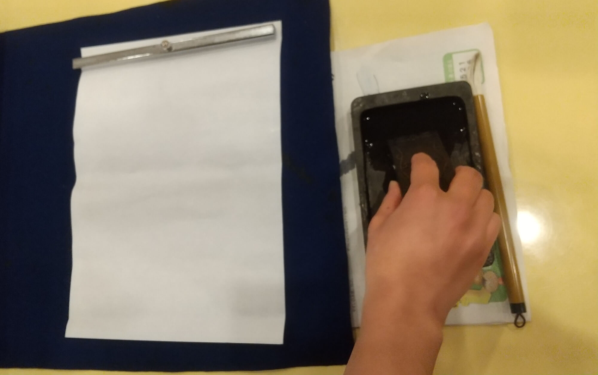 最初は透明だった水が、墨をすることで、だんだん濃くなっていきます。その変化を見て子どもたちは「やりたい!」と積極的に道具に手を伸ばしていました。すずりに勢いよく水を入れたり、力任せに墨をすったりすると、すぐに水があふれてしまいます。活動の中で子どもたちは力のかけ方を少しずつ調整するようになって、好きな濃さの墨汁を作ることができました。
