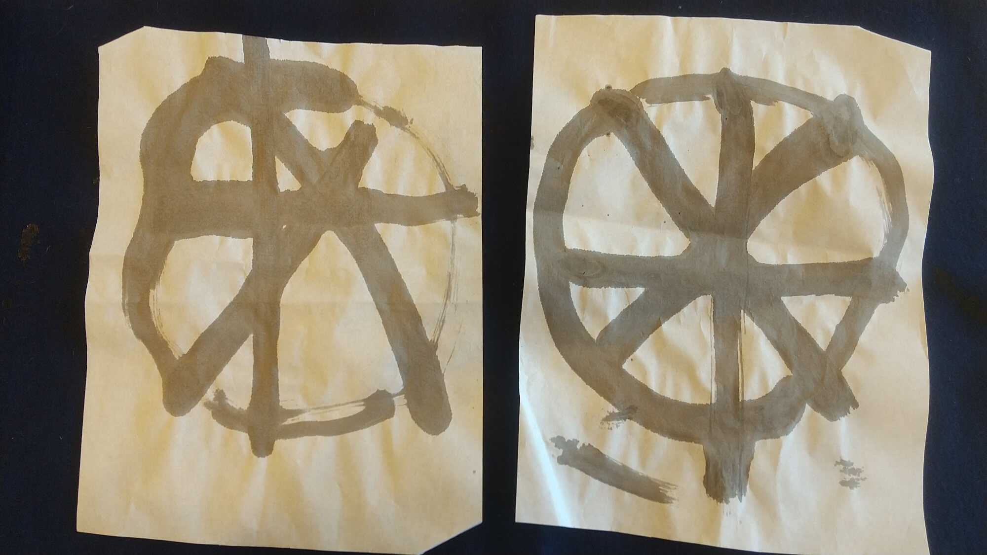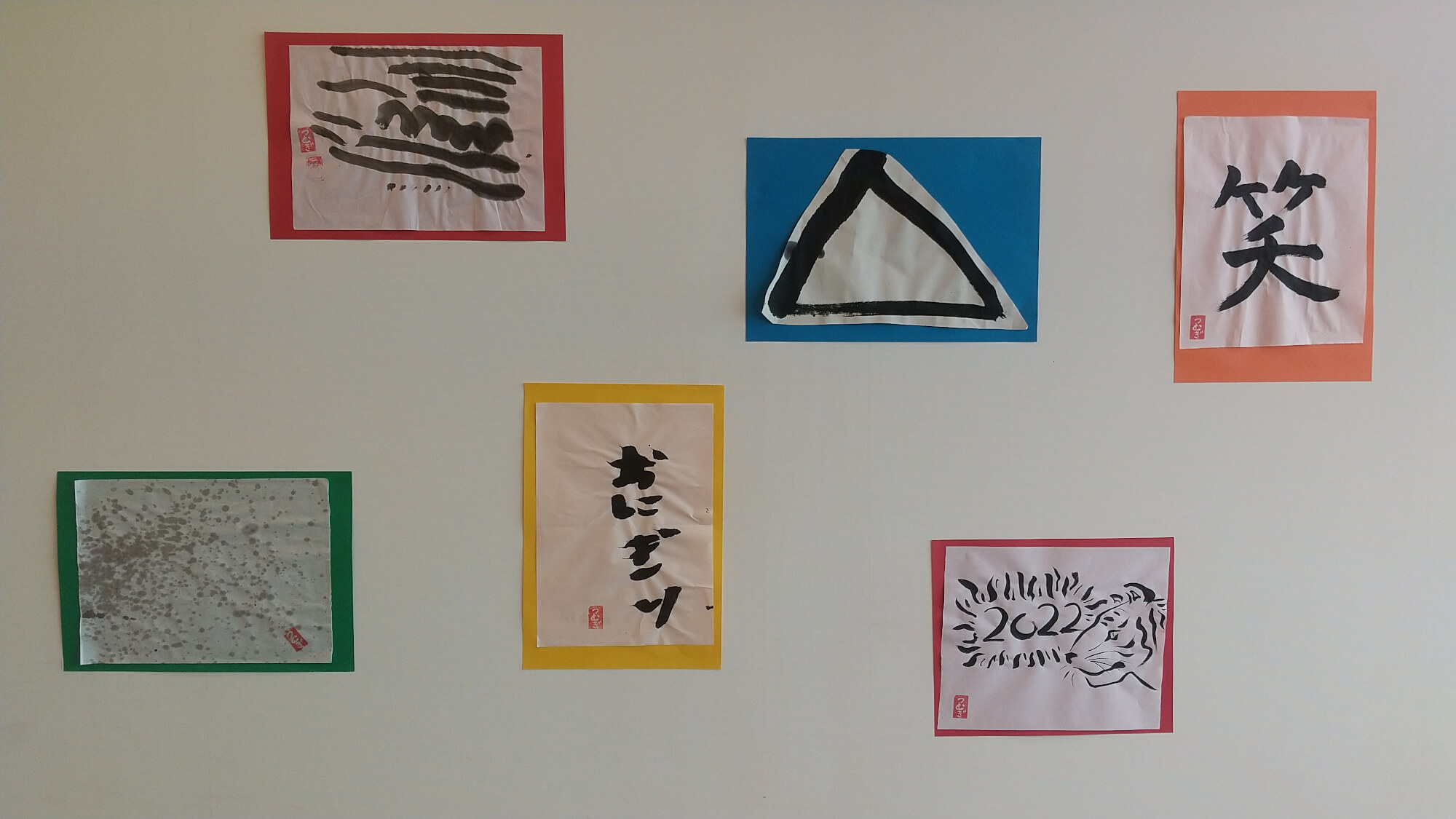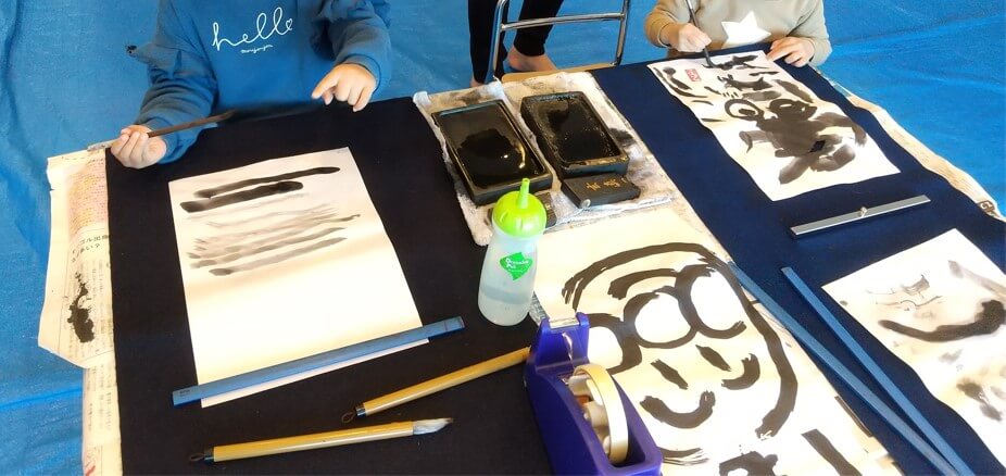 紙は、通常の半紙の他に、障子紙を使って様々なサイズ、筆の太さも様々なものを用意しました。墨汁を散らしたり、大きな筆でいろいろな形や文字を書いたり、思い思いに表現しました。