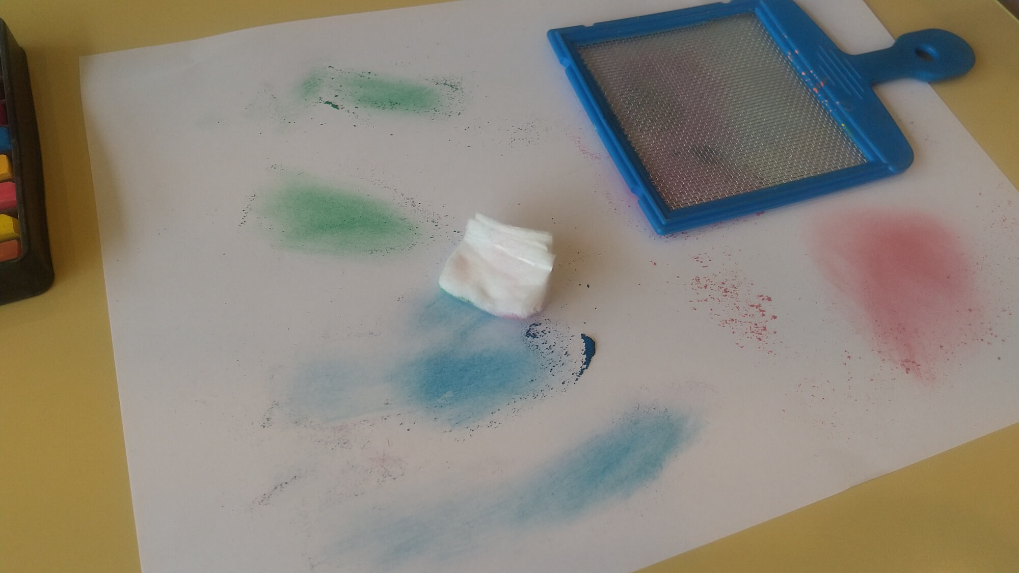 まず、「今の自分」をイメージして3色を選びパステルを紙のパレットに削りだしました。削る音や削る感触に感覚を向けることは、普段の生活ではなかなか体験することがないかもしれません。