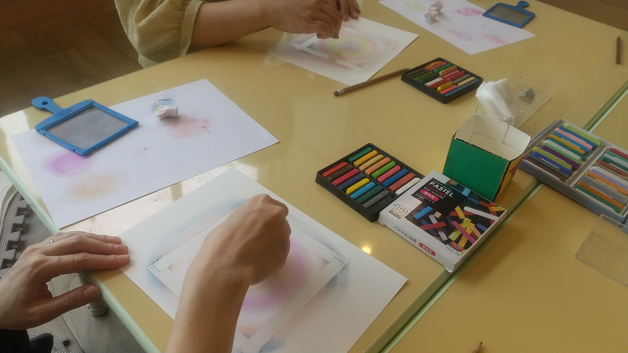 また、普段なかなか話しづらいこと、共有しにくいことも自然と話せる場であると感じてくださった保護者の方もいらっしゃいました。パステルシャインアートという活動を共有することで、心が落ち着き、自分の気持ちを表現することにもつながりました。スタッフと直接話すときとはまた違った表情で保護者同士が話す様子もみられました。