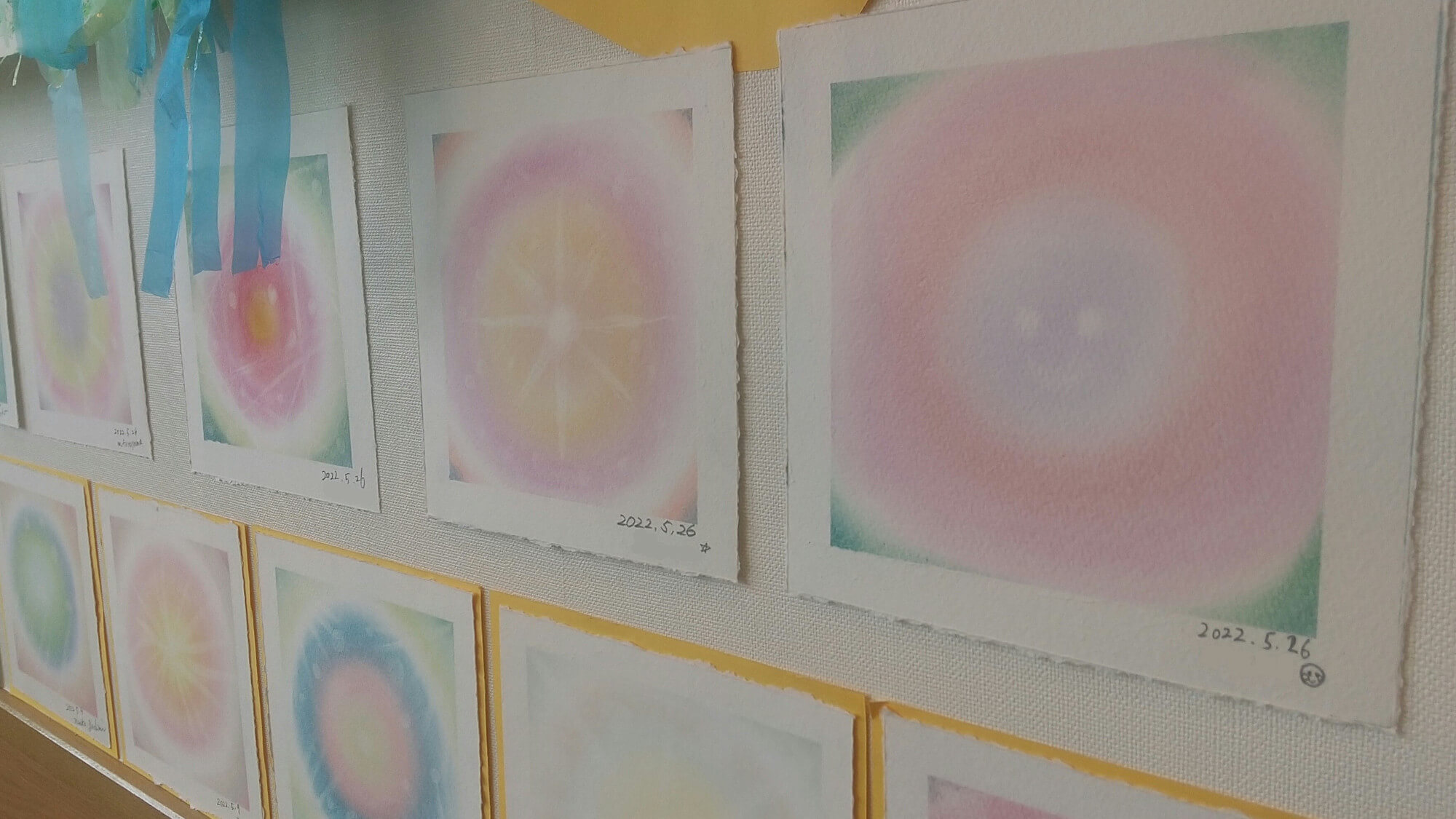 次に、コットンにパステルを付けて薄い色から順番に円をじっくり描きました。内側から外側に変化していく様子を眺めながら皆さん集中して取り組んでいました。