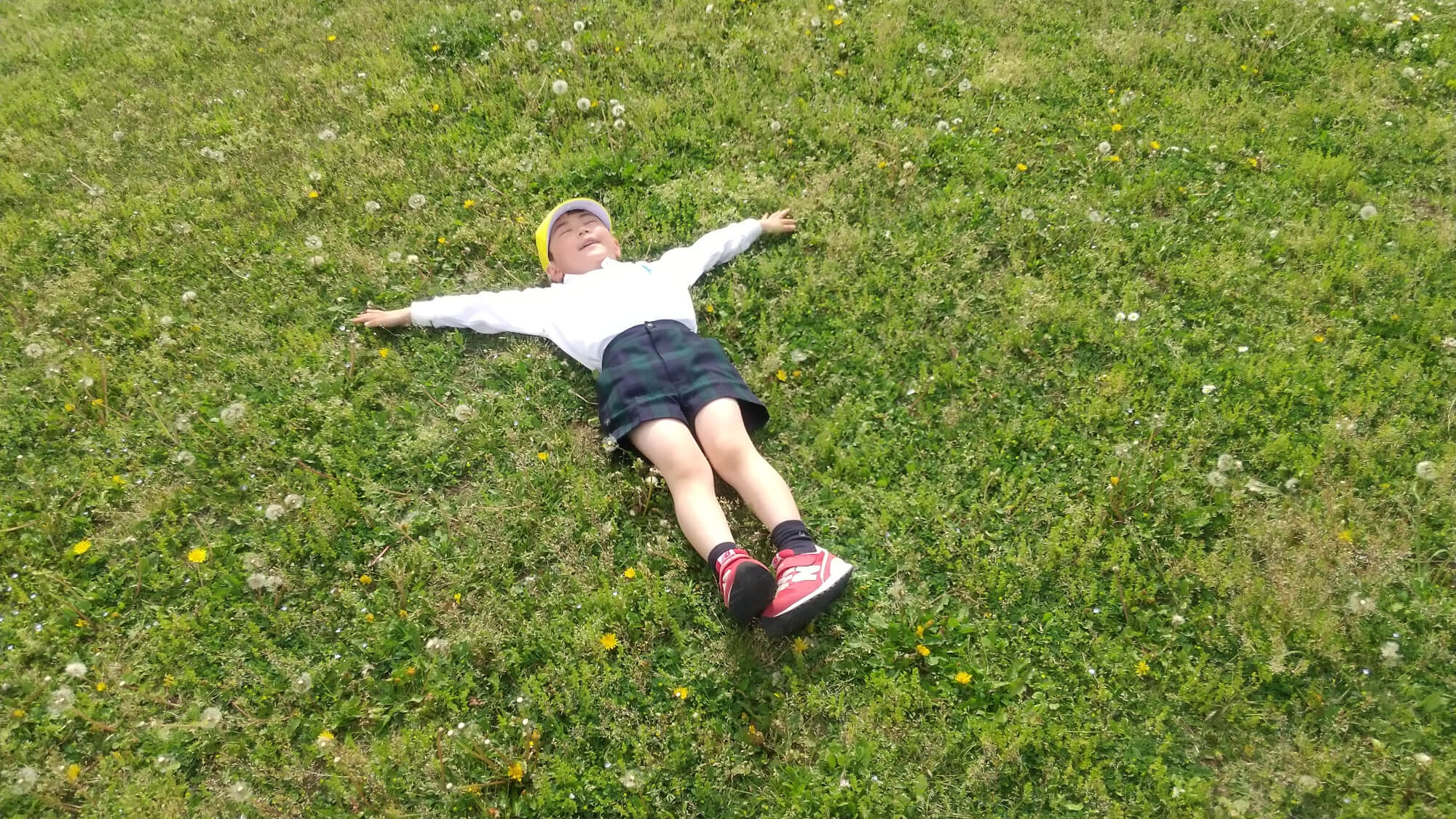 広場に到着すると、思わずかけ出す子、寝転ぶ子、見つけたものを友だちに見せる子等、思い思いに自分の気持ちを表現する姿がみられました。