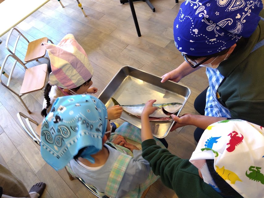 次に魚の臭みを取るために、さばいた魚に塩を振っていきます。指先で塩をつまんでいきますが、塩の感触が楽しくて、つまんで振るよりも掌で触って感触を楽しんでいる子もいました。