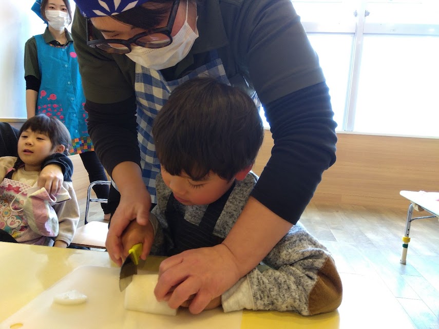 みんなが一通り体験したあとで、「やってみる?一緒にやるから大丈夫だよ」と言葉をかけると「やってみる」と包丁を持ち挑戦することができました。